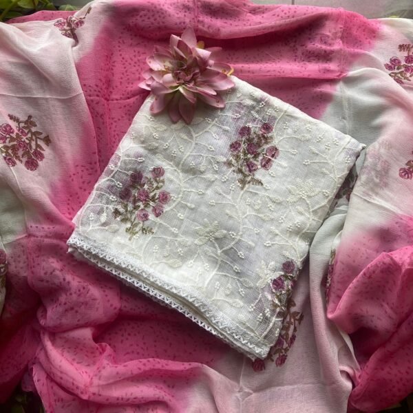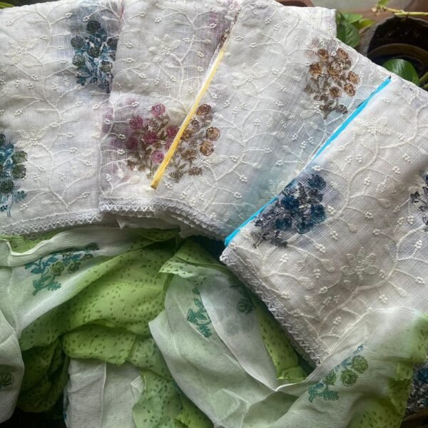 Are you looking out for Beautiful designer kota suits to add to your wardrobe ? These suits with beautiful Offwhite suits with intricate Chikankari is the perfect choice! Pure Kota Doria top with pretty Chikankari embroidery, cotton bottom & pure chiffon with floral prints & hand block prints