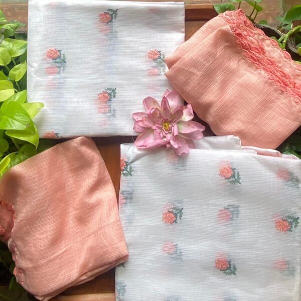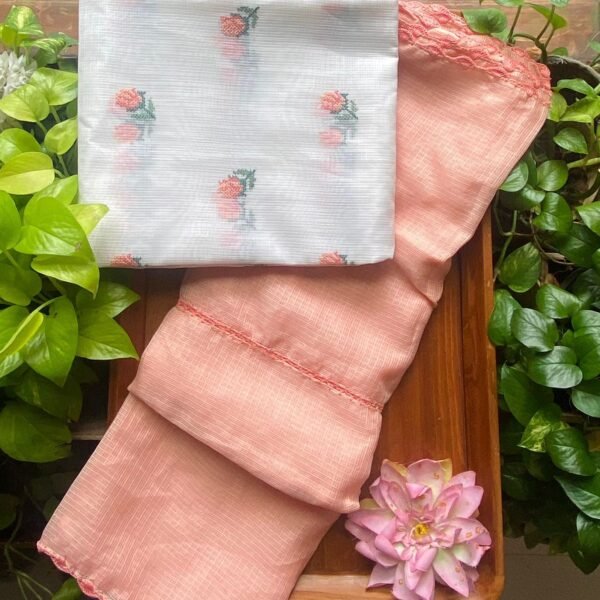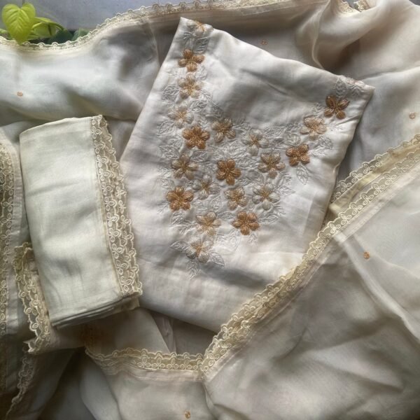 Are you looking out for Beautiful offwhite suits to add to your wardrobe ? These suits with beautiful cross stitch embroidery is the perfect choice! Pure matka silk top with pretty cross stitch embroidery, cotton bottom & Kota silk Duppatta with hand crochet