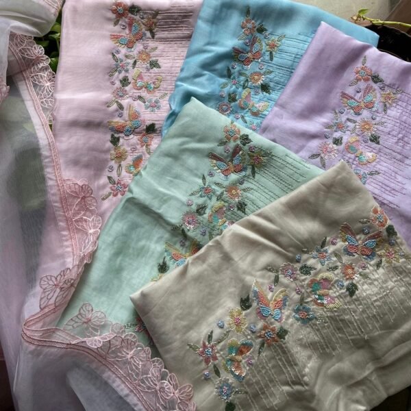 Are you looking out for Premium Silk Suits for the upcoming festive season ? These pastel hued silk suits with intricate hand work & detailing is the perfect choice! Pure Benarasi Chandheri silk top with exquisite hand work & detailing in sleeves & also on santoon bottom & pure organza soft Duppatta woth hand work detailing