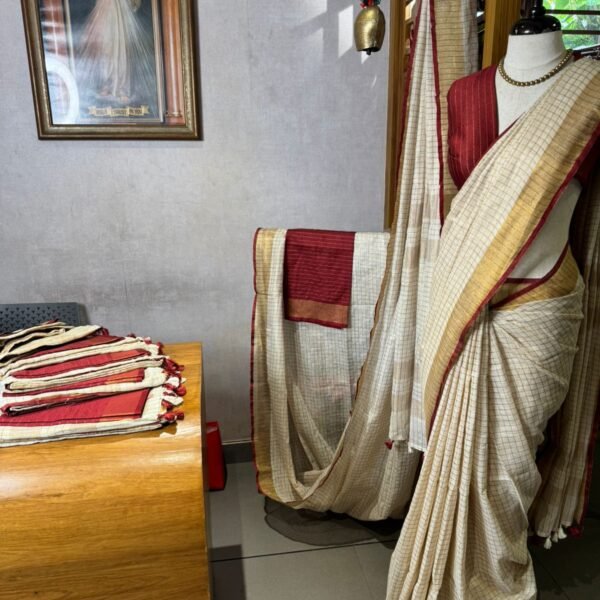 Beautiful & stunning linen silk sarees with elegant check weave and antique gold borders and a pretty red/black/green trimming and blouse and hand done tassels.