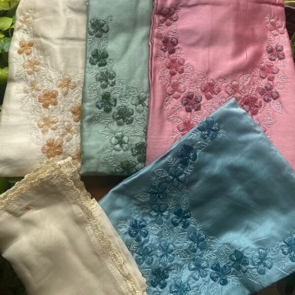Presenting out Brand New Collection for Onam at a Special Price of ₹1499/- curated on Chiffon woth Cutwork and beautiful floral embroidery! Ethereal hues of Pink, Pearl Green, Ivory gold, Dusty pink & Jet black on Chiffon top and Duppatta with floral embroidery & Cutwork. The floral embroidery design is created to resemble pearl embroidery. Bottom is cotton silk