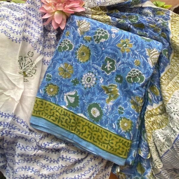 Are you looking out for Beautiful cotton suits to add to your wardrobe ? These suits with beautiful floral prints is the perfect choice! Pure cotton top with pretty floral prints , printed cotton bottom & chiffon duppatta with floral prints