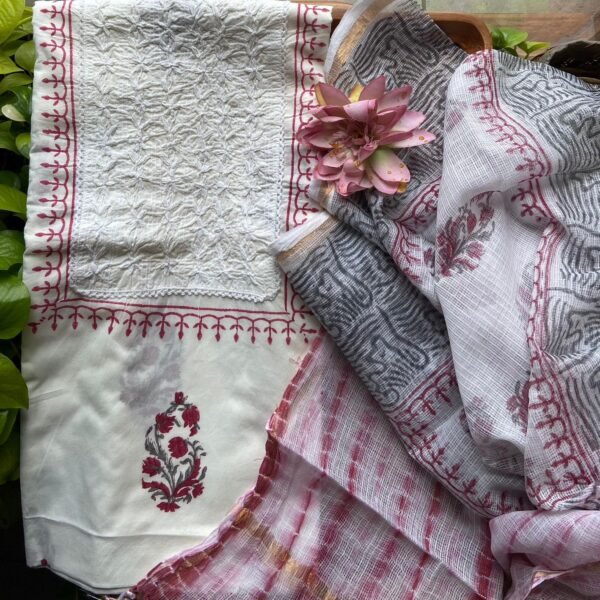 Are you looking out for Beautiful designer cotton suits to add to your wardrobe ? These suits with beautiful Offwhite suits with intricate Chikankari is the perfect choice! Pure cotton top with pretty Chikankari embroidery, cotton bottom & pure Kota Doria with floral prints & hand block prints