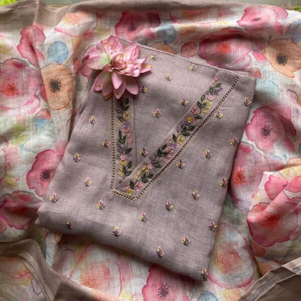 Are you looking out for Beautiful Linen suits to add to your wardrobe ? These suits with beautiful hand work is the perfect choice! Linen top with beautiful floral embroidery , santoon bottom & linen floral printed dupatta