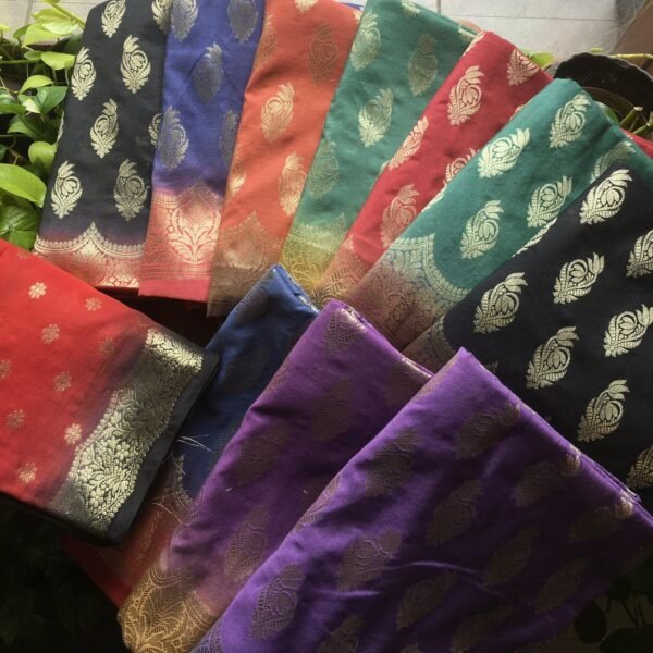 Are you looking out for Beautiful silk suits to add to your festive wardrobe ? These suits with beautiful Benarasi weaving is the perfect choice! Chandheri silk top & Duppatta with beautiful Benarasi weaving, cotton bottom & Benarasi Chandheri silk Duppatta