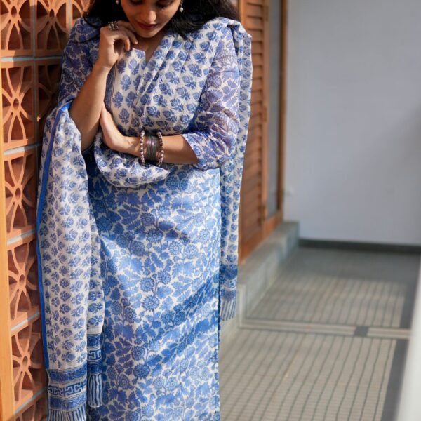 Available now !!!Dispatch time 10 working days !!! Are you looking out for a Stunning Suit to best the summer heat in style ? These Blue pottery inspired pure Kota Doria Suits are the perfect choice! Pure Kota Doria top & Duppatta with beautiful Block prints & cotton bottom
