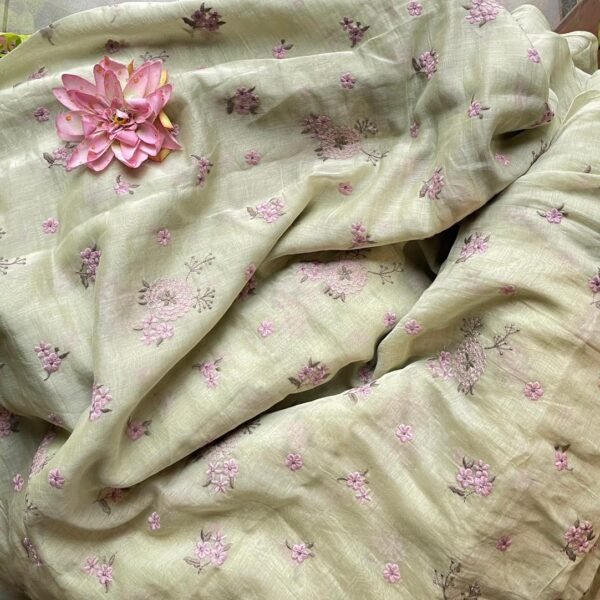 Running fabrics in pure 40gm Mul Chandheri with the most dainty floral embroidery in beautiful pastel tones! You can avail a minimum of half metre to the no of metres you require to design your attire !