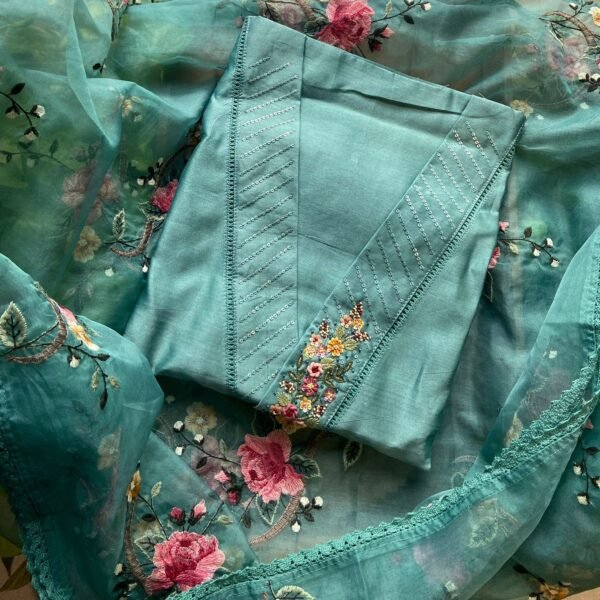 Stunning Pure Benarasi Chandheri silk top with intricate hand embroidery detailing on neckline & sleeve borders, embroidered patch on santoon bottom & beautiful organza Duppatta with embroidery