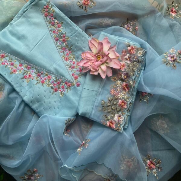 A beautiful premium collection of pure Benarasi Chandheri silk top with exquisite hand embroidery at neckline , sleeve borders & also embroidery on santoon bottom & organza Duppatta with exquisite embroidery