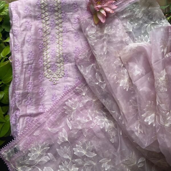 A beautiful collection of pure Benarasi Chandheri silk top with complete embroidery , santoon bottom & silk organza Duppatta with complete embroidery & French lace borders