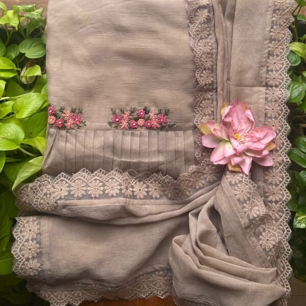 A beautiful collection in crush georgette top with beautiful hand embroidery featuring bullion knots, laisy daisy stitches & intricate pearl embroidery , French lace border for sleeves, cotton silk bottom & crush georgette Duppatta with french lace borders along all borders