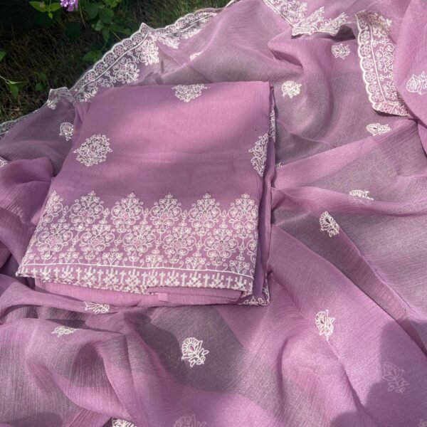 A stunningly gorgeous collection in crush georgette top & chiffon Duppatta with intricate Chikankari embroidery all along & cotton silk bottom