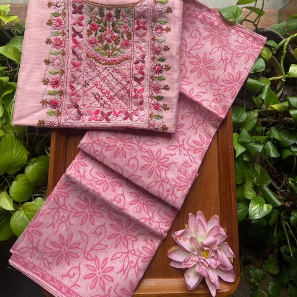 A stunningly gorgeous hand made matka silk top with intricate floral embroidery on yoke & sleeves, cotton bottom & matka silk Duppatta with block prints . Premium & limited in numbers hurry before we run out of these