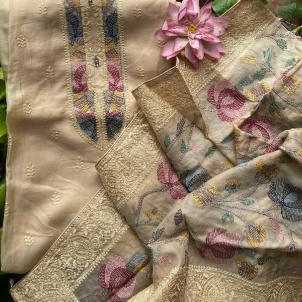 A stunningly gorgeous collection in pure silk organza top with intricate embroidery all along top , santoon bottom & beautiful silk organza Duppatta with full embroidery