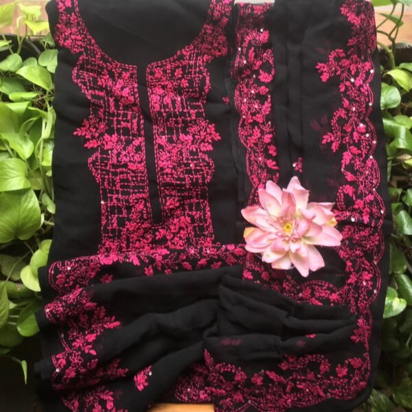 A beautiful collection of Pure Viscose georgette top & Duppatta with beautiful & intricate Nakshi Kanta Hand embroidery all along yoke & length of top & sleeves & Duppatta with complete Nakshi Kanta work & santoon bottom