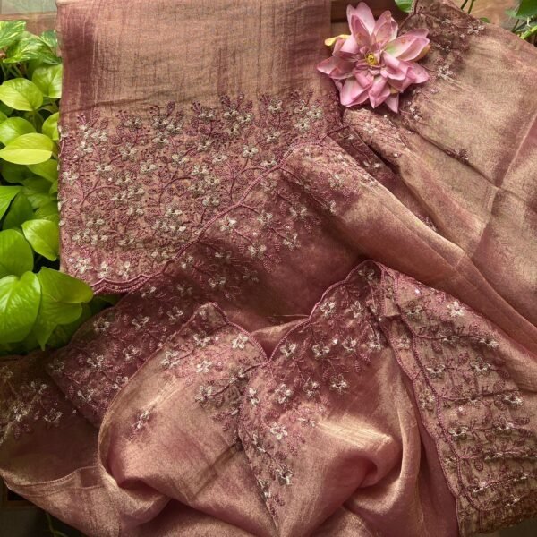 Presenting Our Beautiful New designer wear in Tissue Organza top with exquisite embroidery on the top & Duppatta in a very pretty floral pattern & cotton silk bottom . Handcrafted in beautiful pastel hues with antique gold hue these are the perfect choice for Onam !