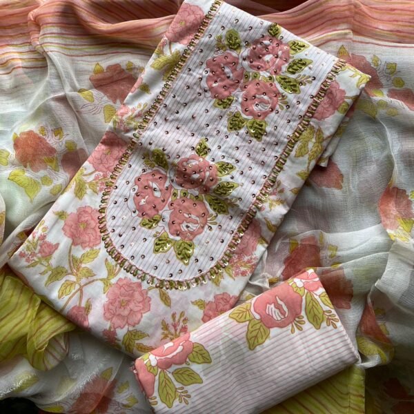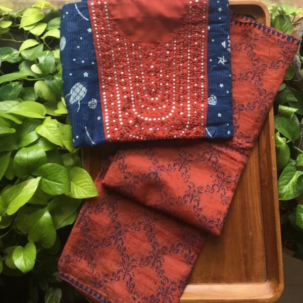 Are you looking out for Beautiful & Unique Designer Cottons to add to your wardrobe ? These Hand block printed Kutch worked cottons are the perfect choice! Pure cotton top with authentic Kutch work (does not need lining ) cotton printed bottom & hand block printed chiffon duppattas