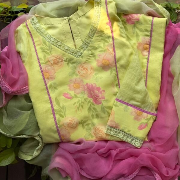 A beautiful blend Of Lime Green and Petal Pink with the gorgeousness of floral prints and delicacy of crochet detailing !Presenting a Beautiful Designer Suit in Pure Malai Chandheri with stylish floral prints and crochet detailing as panel cut on top and sleeve ends , santoon bottom with crochet detailing and a stunning ombré dyed chiffon Duppatta with lace edging(The suit is unstitched material with all styling and detailing done. Can be custom stitched as well on request )