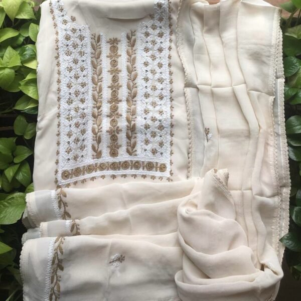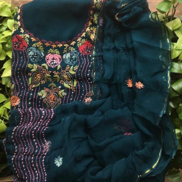 A beautiful designer collection in Pure Georgette top and Duppatta with exquisite Chikankari embroidery and santoon bottom
