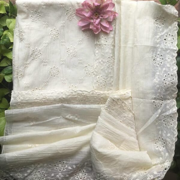 A premium Malai Chandheri Easter Collection in pastel hues with exquisite Cutwork Hakoba all along top and Duppatta and santoon bottom