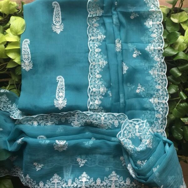 Presenting Our Brand New Collection for Easter in Crush Georgette with exquisite Chikankari embroidery on top and Duppatta in a delicate paisley motif and beautiful floral embroidered borders and scallop on Duppatta. Cotton silk bottom !