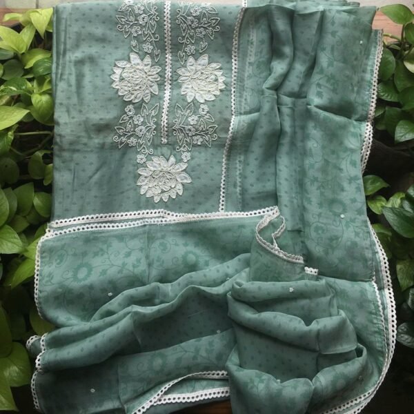 A premium Pastel Easter Vishu Collection in pure Benarasi Chandheri silk with exquisite Pearl embroidery, santoon bottom & a pure viscose organza Duppatta with exquisite pearl embroidery & French lace detailing