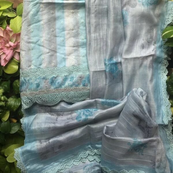 A Premium designer collection in Premium Pure Muslin Silk with pretty & contemporary block prints & exquisite floral embroidery & Cutwork lace on top & pure organza Duppatta & cotton bottom