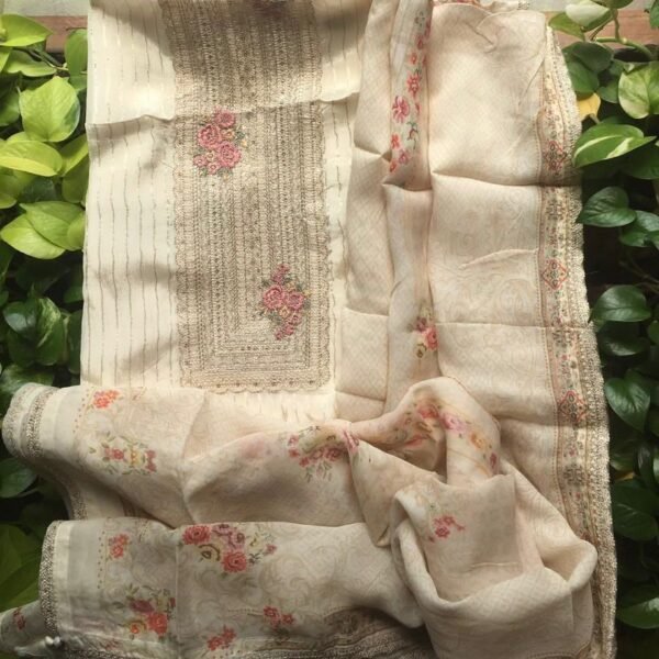 A Premium designer collection in Pure premium crepe silk top with exquisite hand embroidery & embroidery detailing for sleeves & hemline , santoon bottom & pure organza Duppatta with beautiful embroidery borders & floral prints
