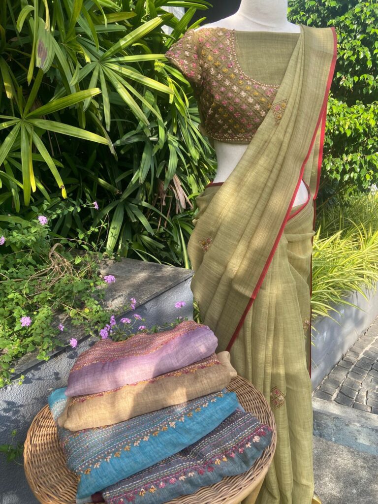 A beautiful collection of Tussar silk sarees with very elegant check weaving on entire saree & borders finished with beautiful cross stitch reminiscent floral embroidery. With blouse pure Benarasi silk