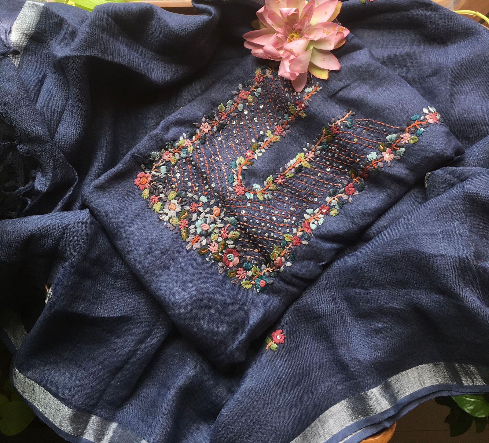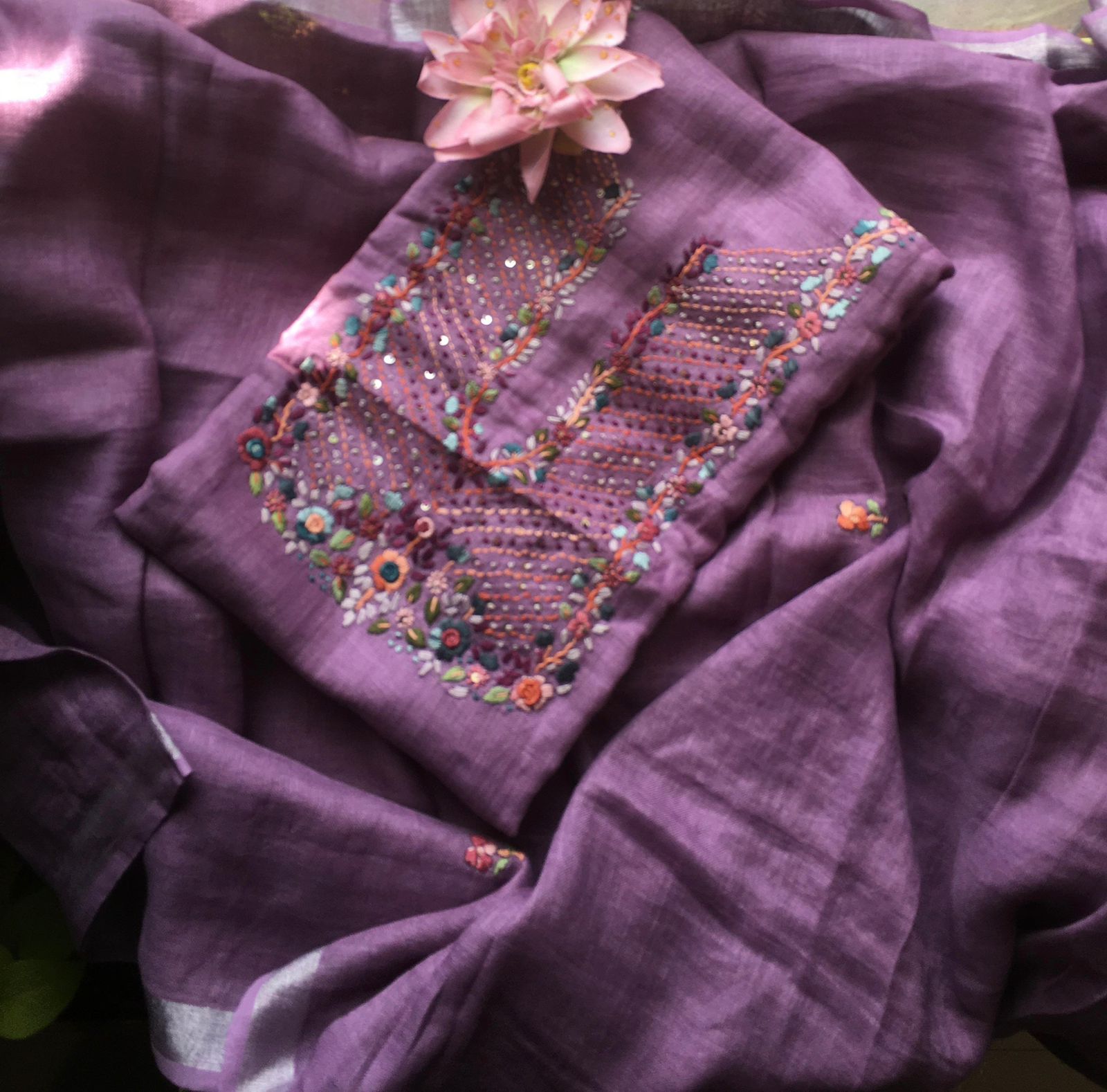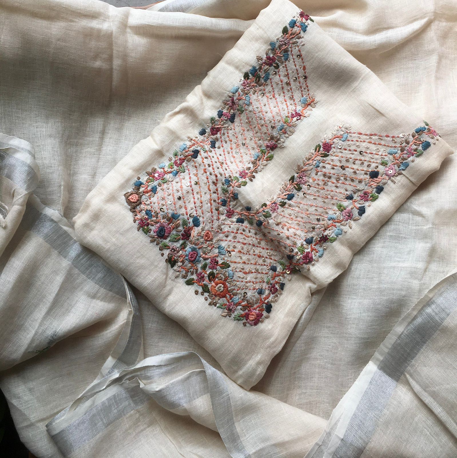A Beautiful designer collection in Linen top with exquisite embroidery & French lace detailing & block prints , cotton bottom & stunning silk Duppatta with embroidery & Floral borders