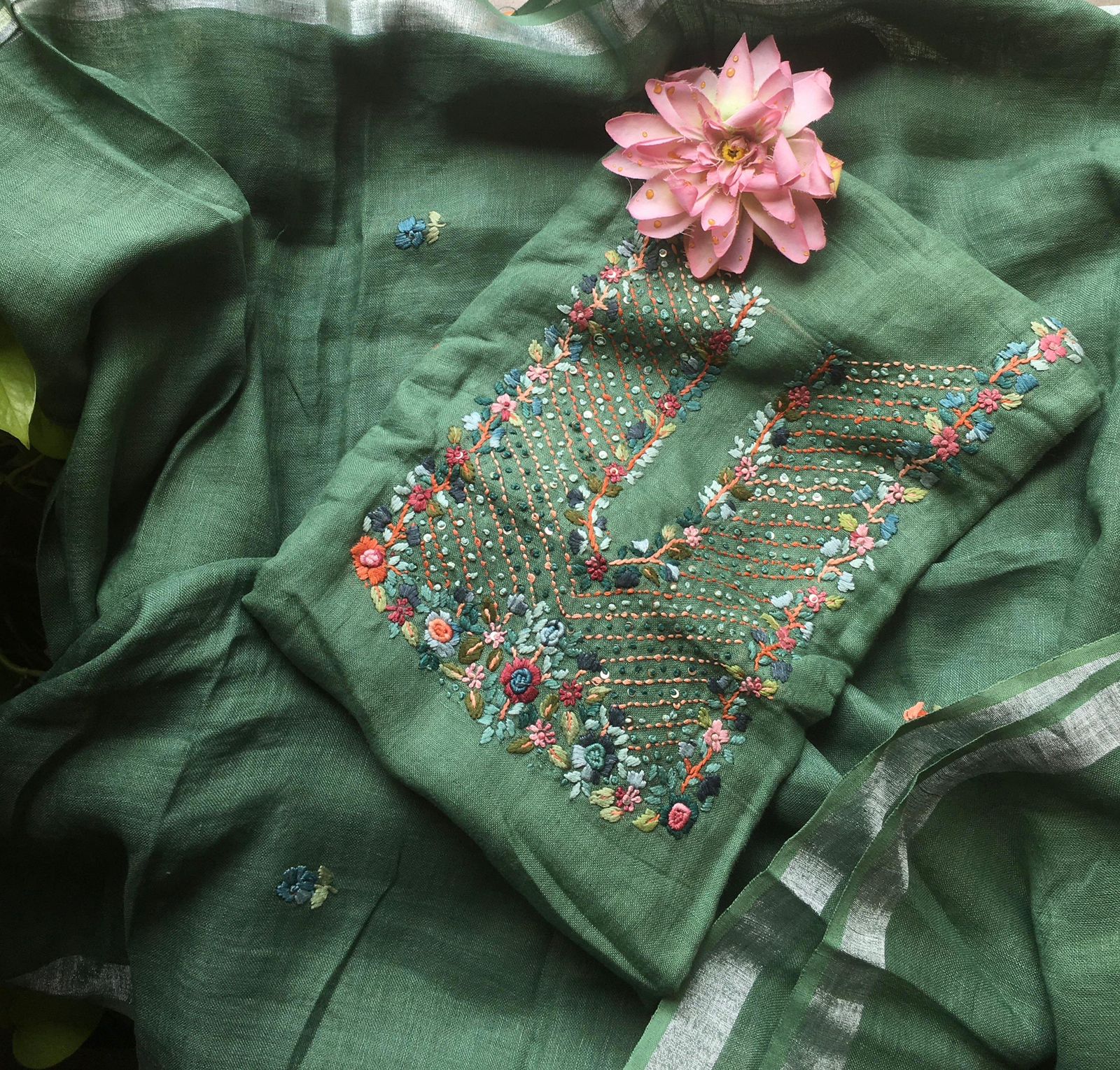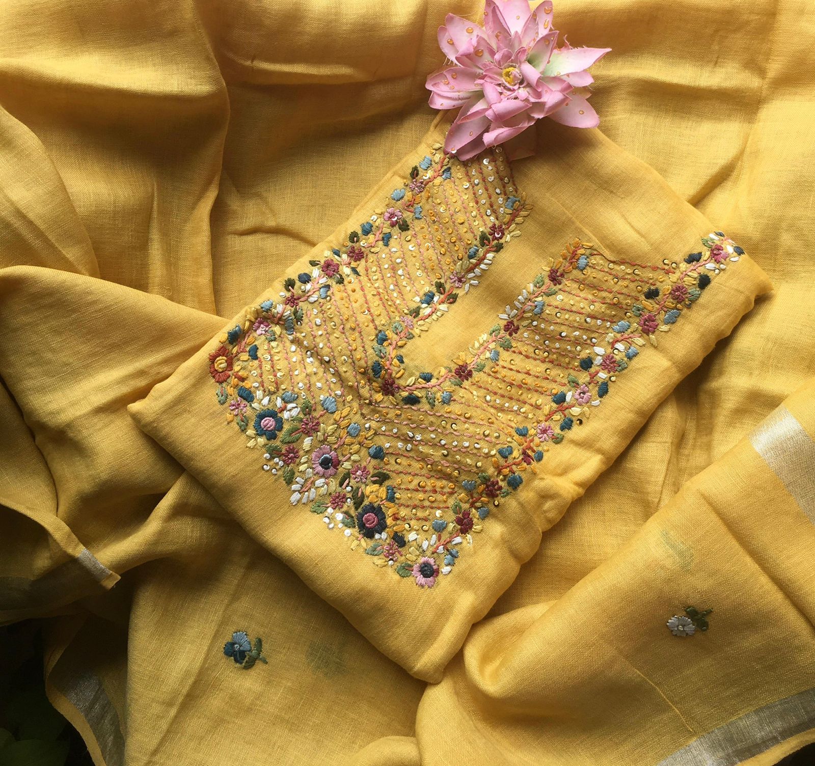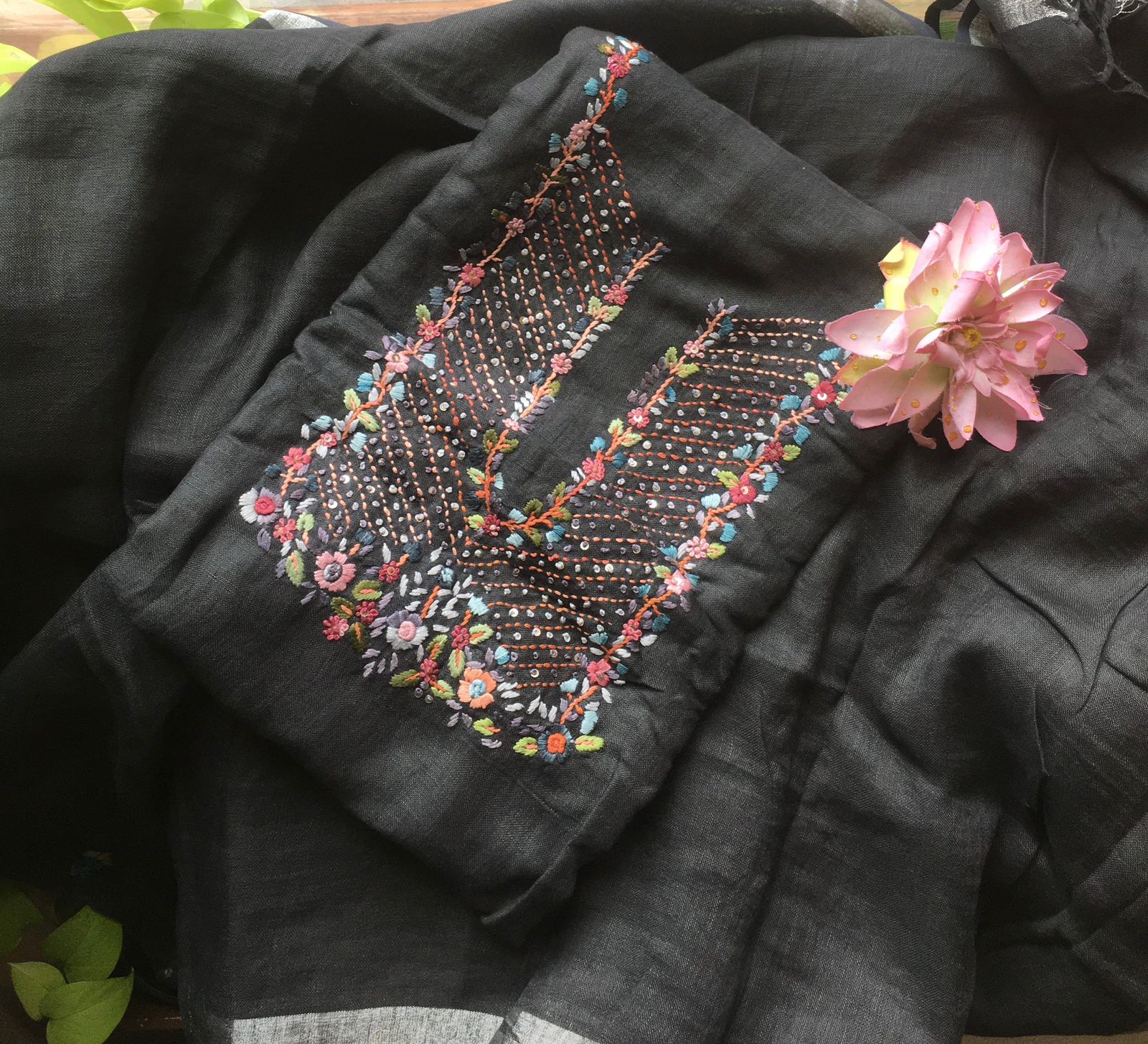 A Beautiful designer collection in Linen top with exquisite embroidery & French lace detailing & block prints , cotton bottom & stunning silk Duppatta with embroidery & Floral borders
