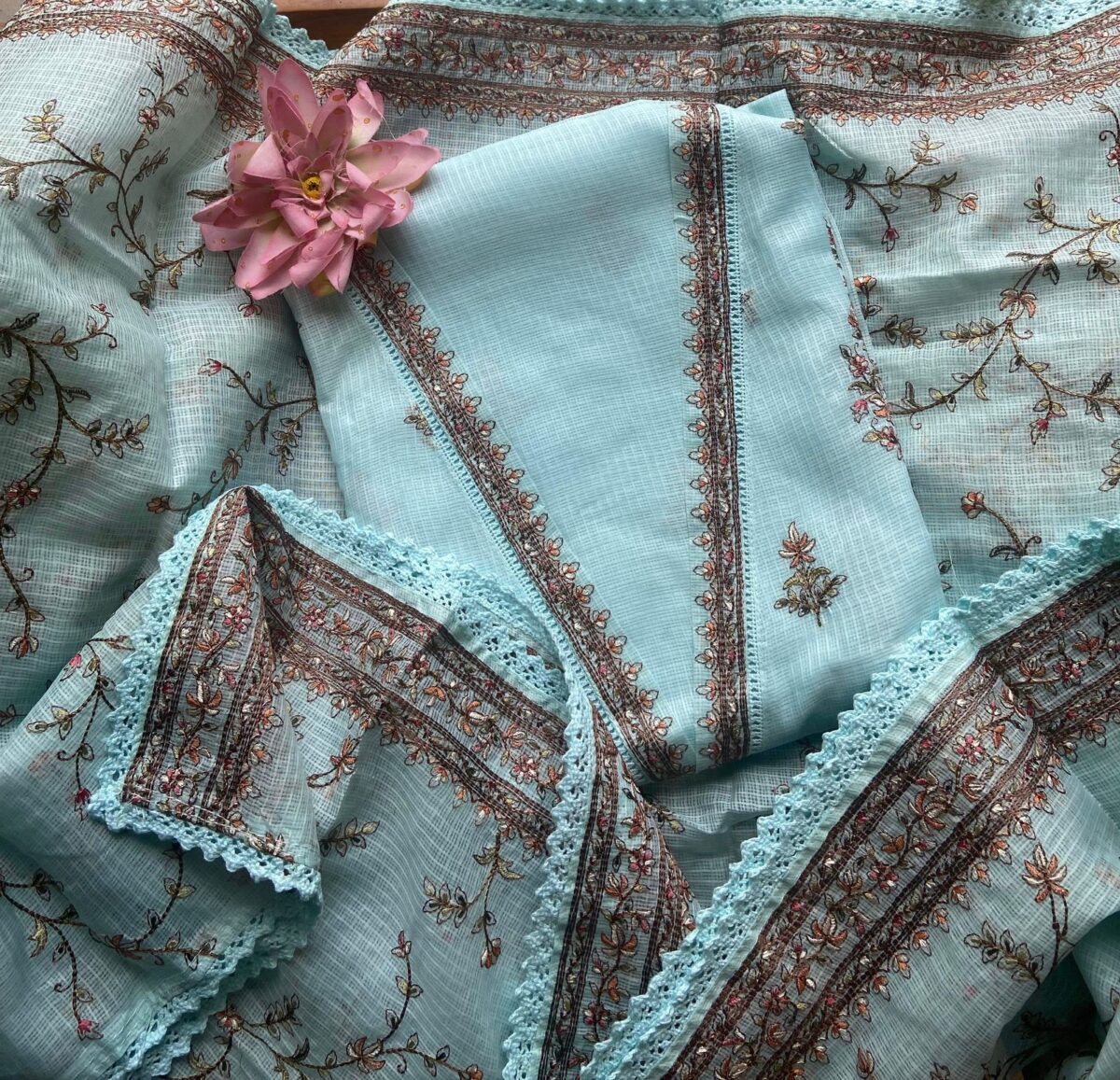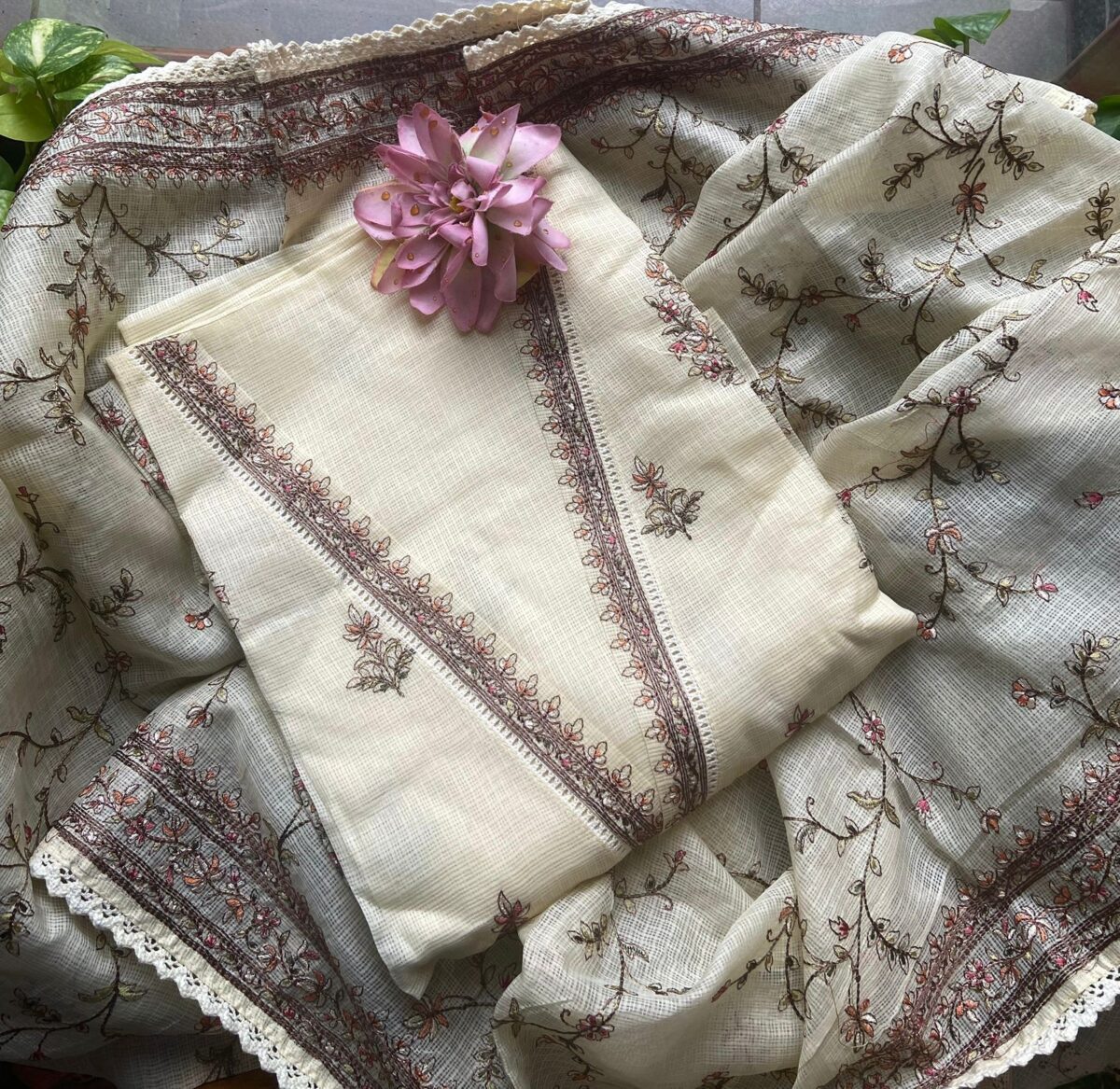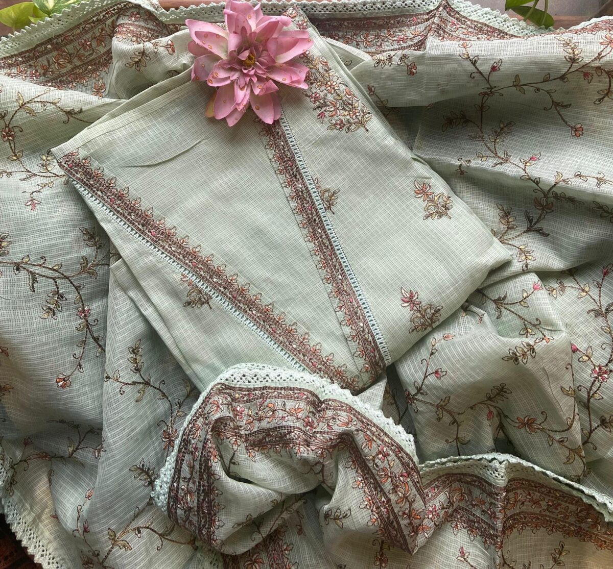 A beautiful collection in pure Kota silk top and Duppatta with intricate Aree embroidery and cotton botto