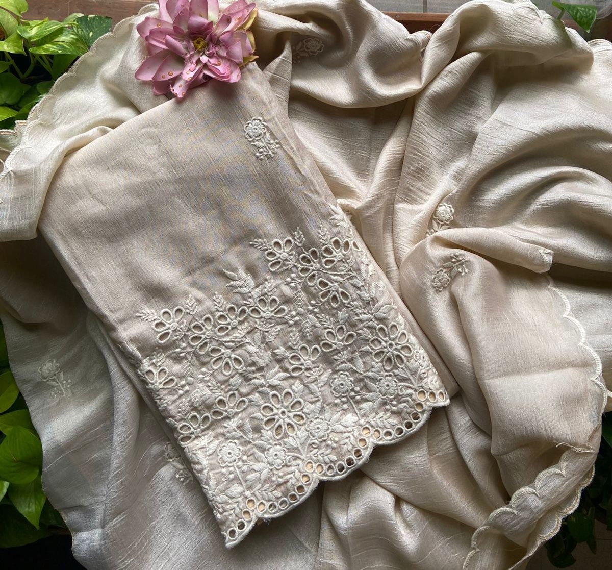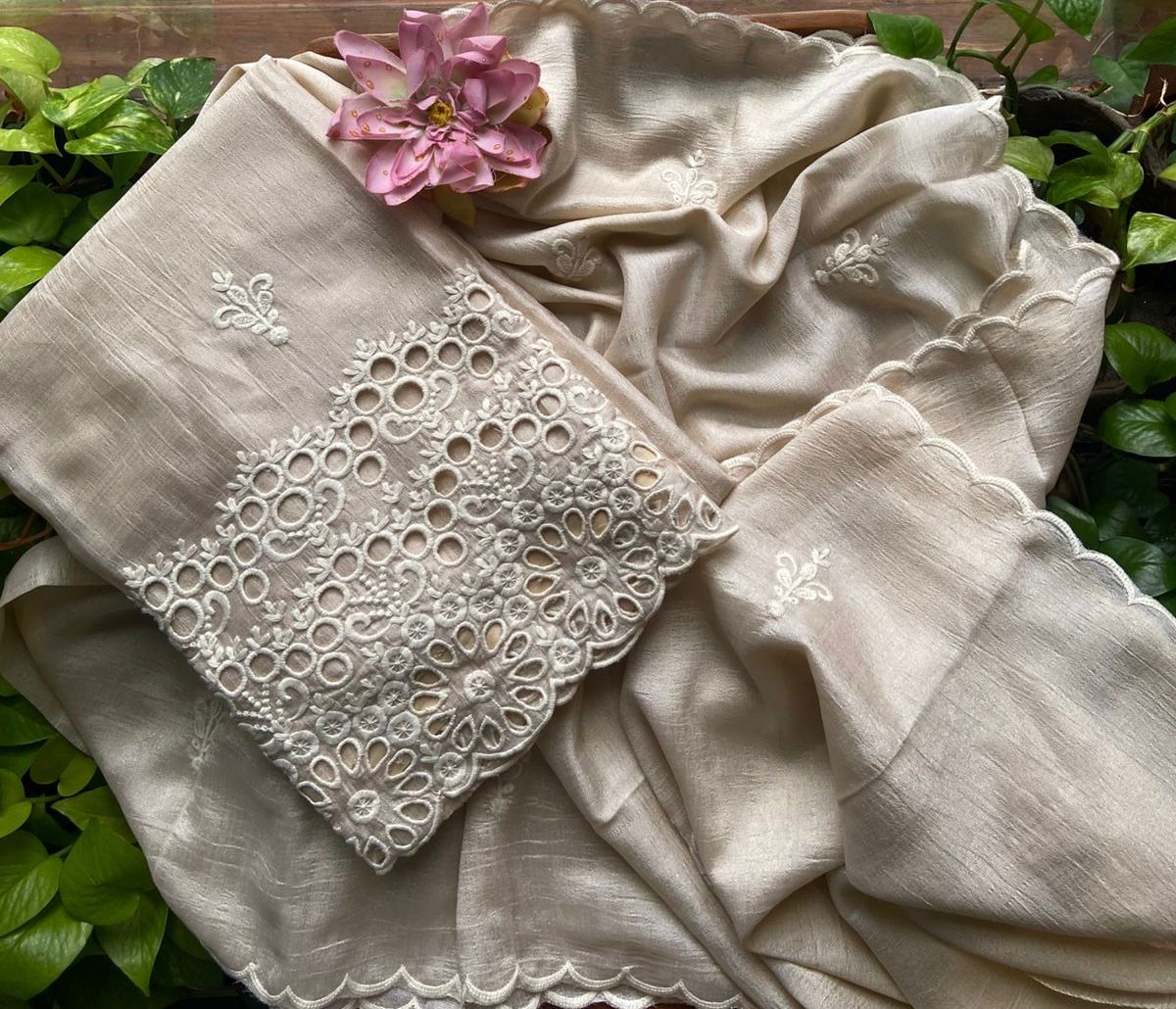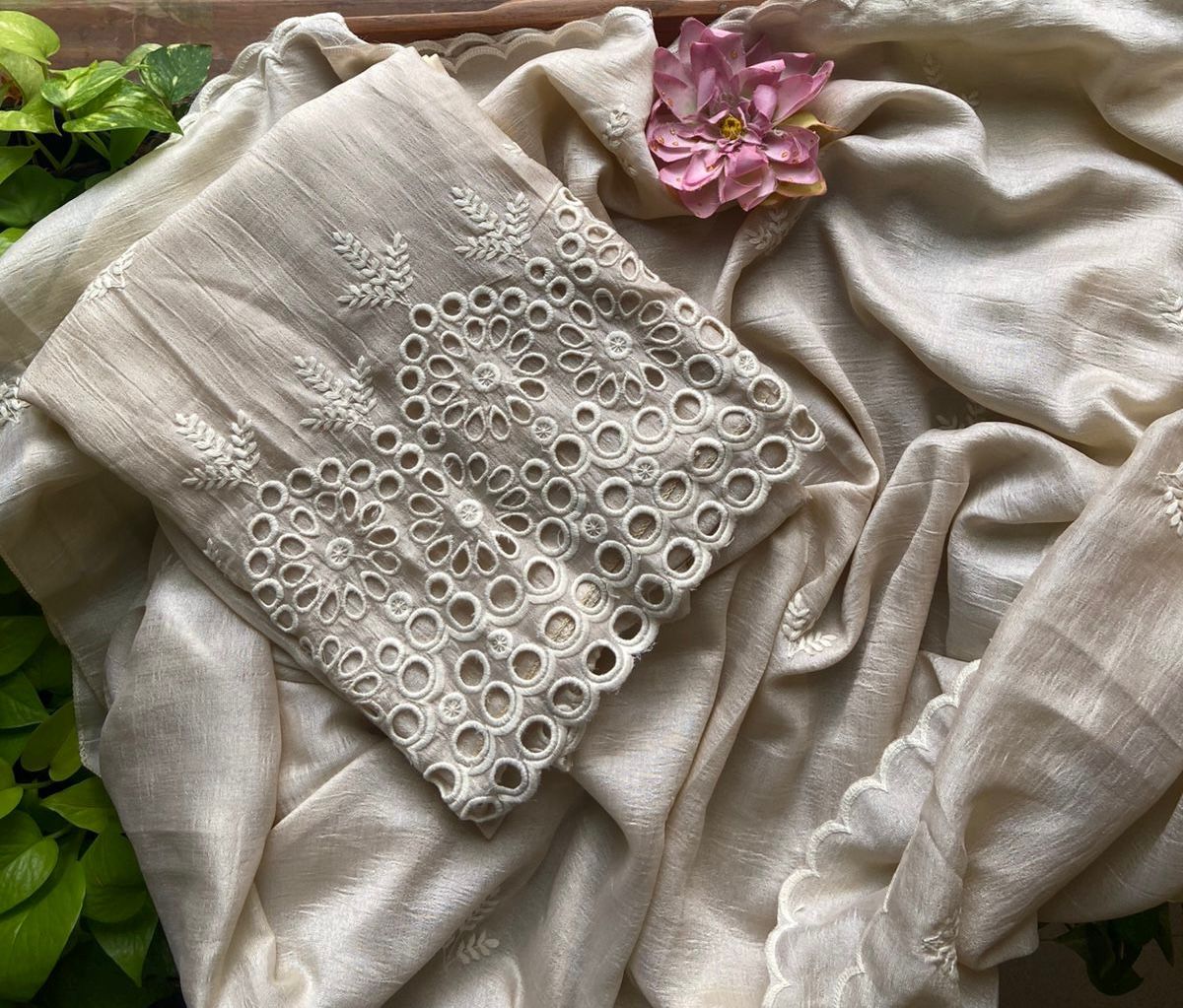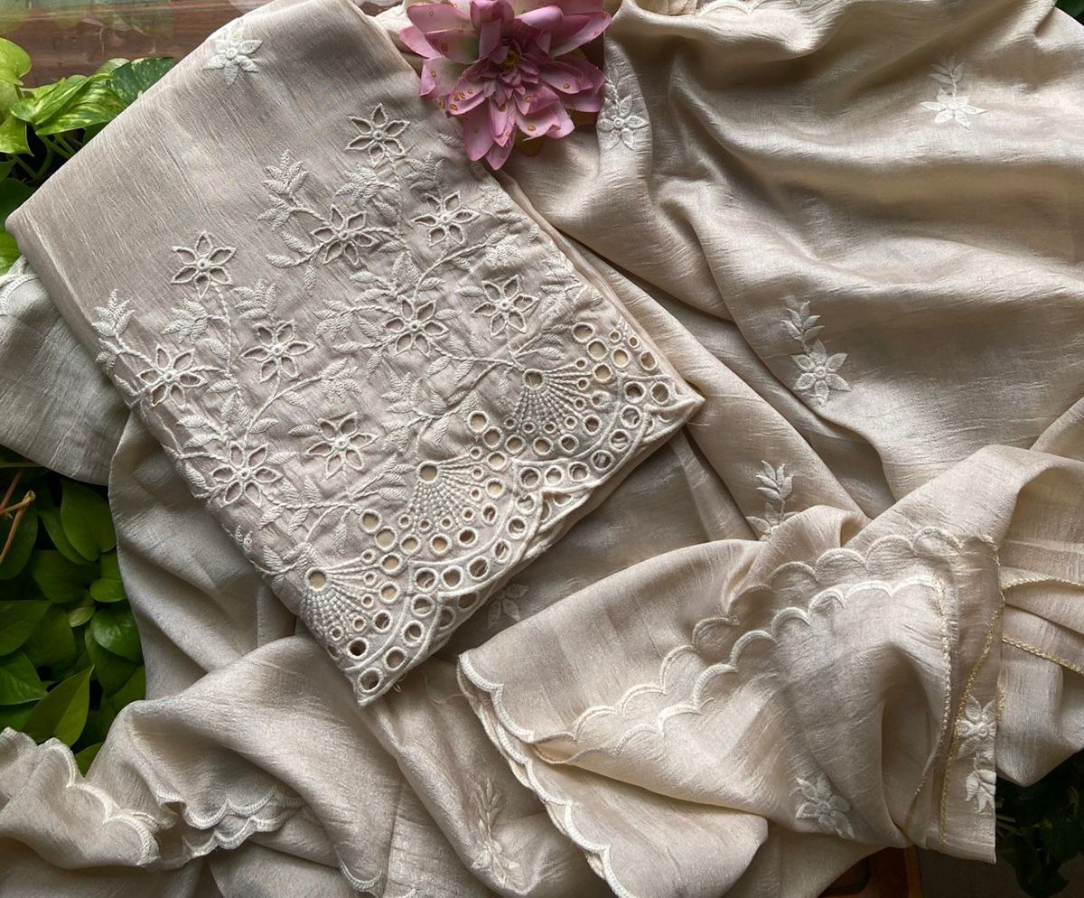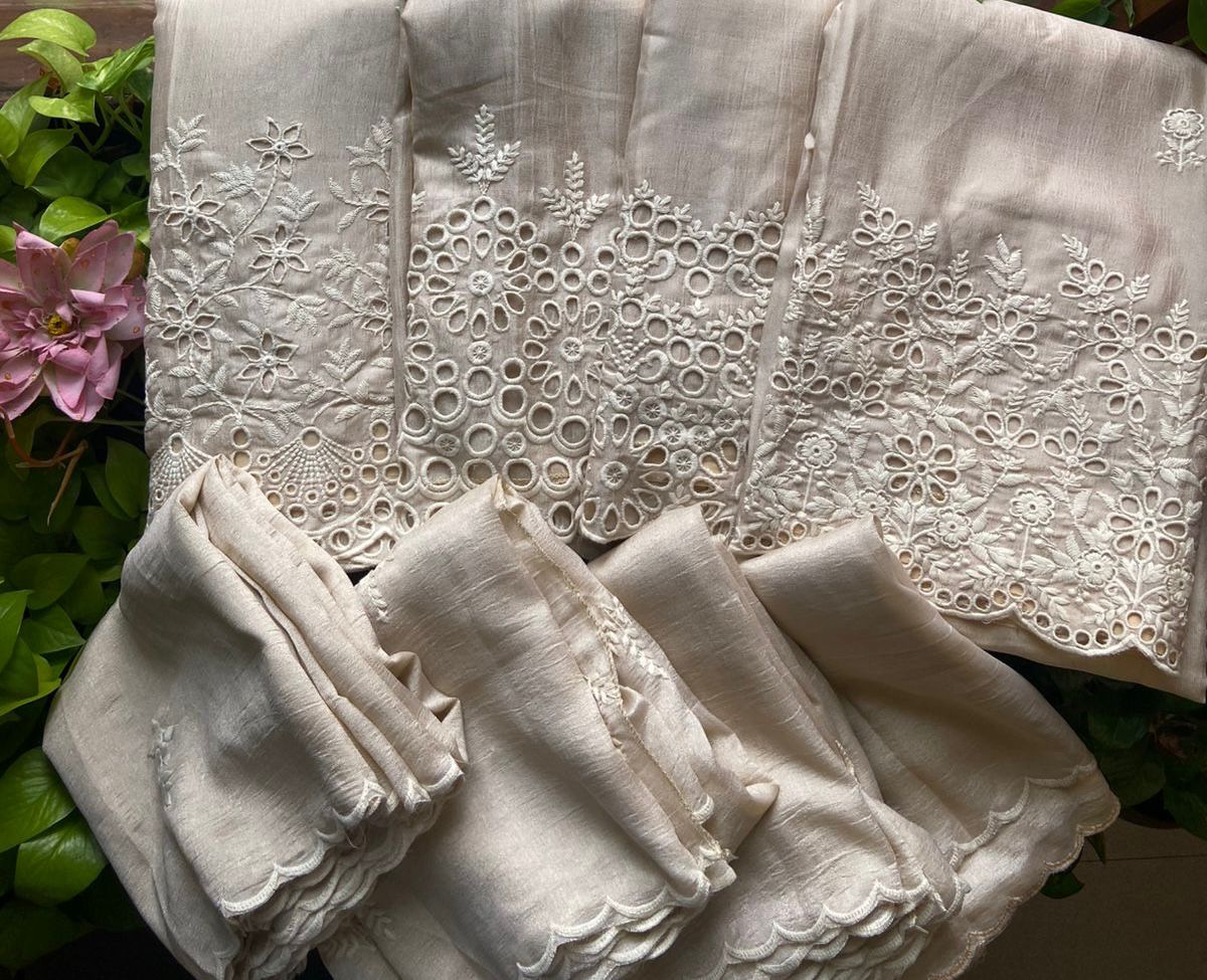A beautiful collection of Semi tussar silk top and Duppatta with intricate Chikankari embroidery and and Cutwork and cotton silk bottom. Style these for a beautiful wear this Onam !