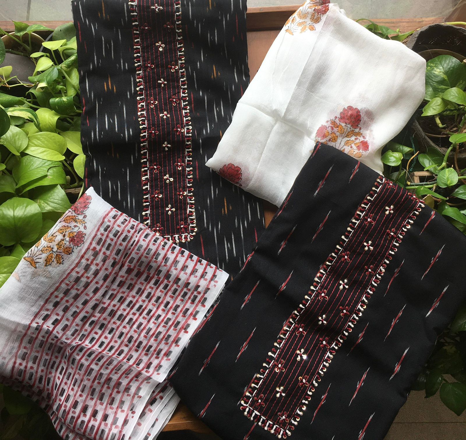 HomeSalwar Set ☘️A beautiful & unique collection in pure Ikkat top with Kutch hand embroidery, cotton bottom and pure chiffon Duppatta