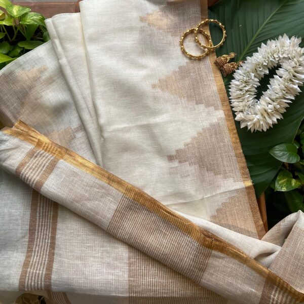 Presenting our Very Elegant Design for Onam , on Linen Silk with beautiful temple borders from the weavers of North India ! Super stunning Offwhite & Gold hued temple border saree with a thin golden borders, golden Bavanchi pallav, tassels & golden striped blouse piece!