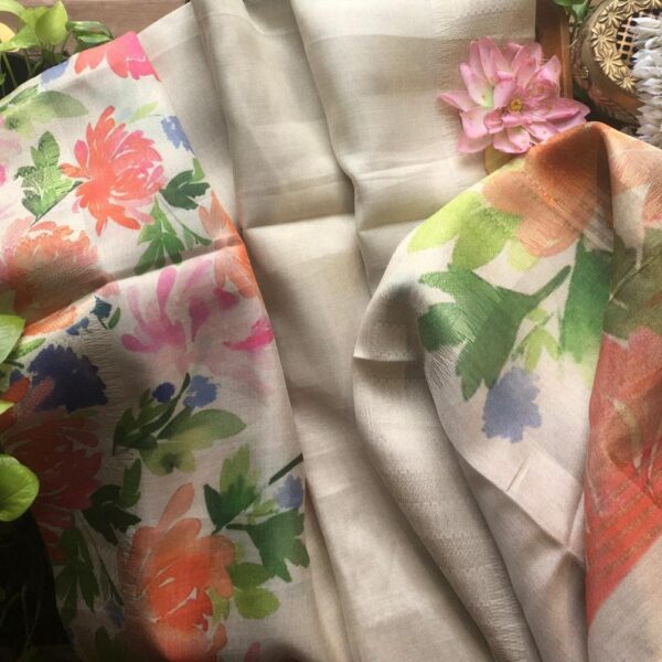 Our Beautiful Onam Edit in Chandheri Tissue Saree with stunningly gorgeous floral prints & Benarasi weave along borders & pallav !!! The blouse piece is truly special with tiny floral prints & striped. So stunning & elegant at a special price of ₹1599/- Styling tip : The saree is so elegant and pretty , the blouse can be styled to closed backs or simple v necks for a stylish feel