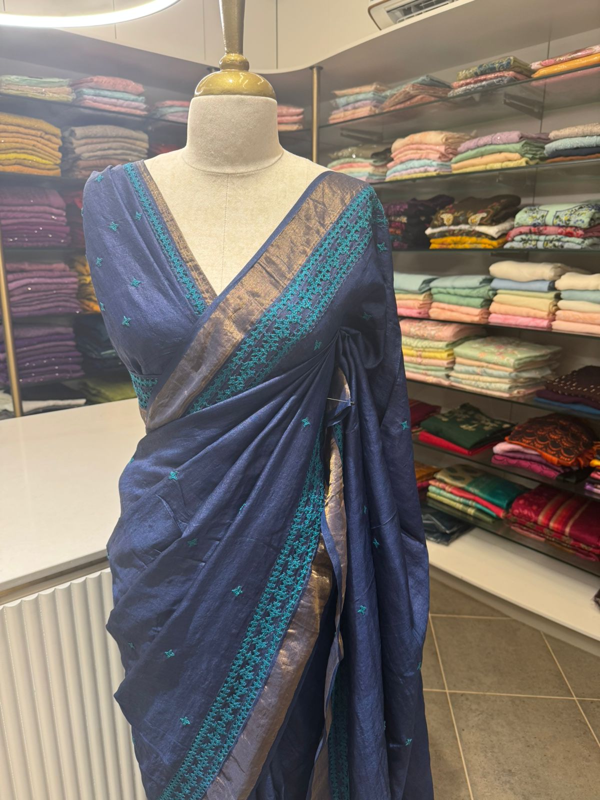 HomeSarees ☘️A stunningly gorgeous premium pure tussar silk saree with beautiful hand embroidery all along saree featuring Kutch work and on blouse and pallav.