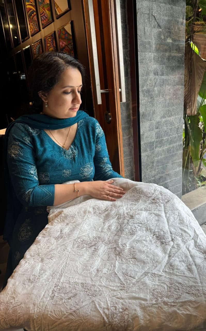 Ethereal & Classy, Off-white Floral Linen Set (Top & Dupatta) with beautiful floral prints and cotton bottom.