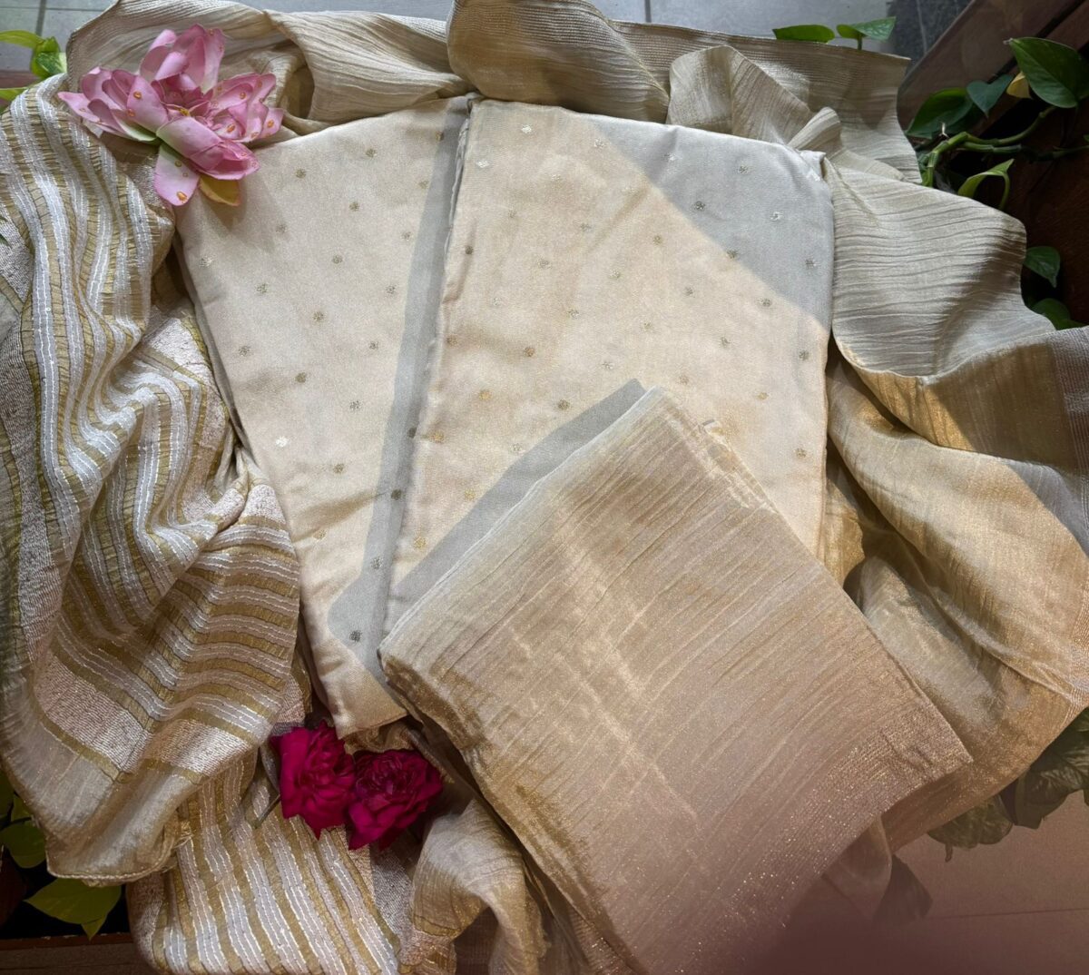 Presenting Our Beautiful new collection in Tissue georgette top with exquisite polka hand weaving , santoon bottom & tissue georgette Duppatta with hand weaving & tassels