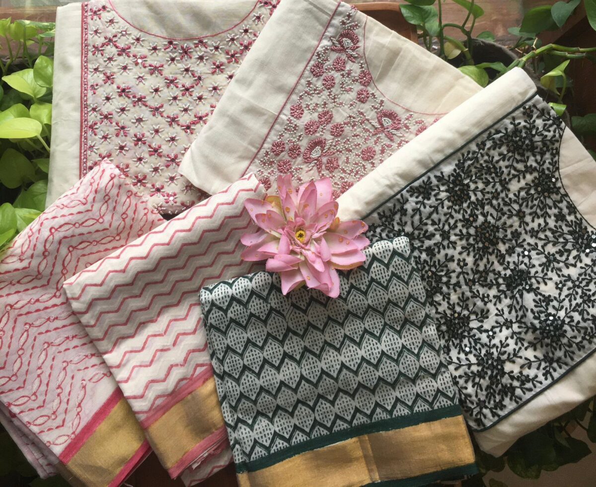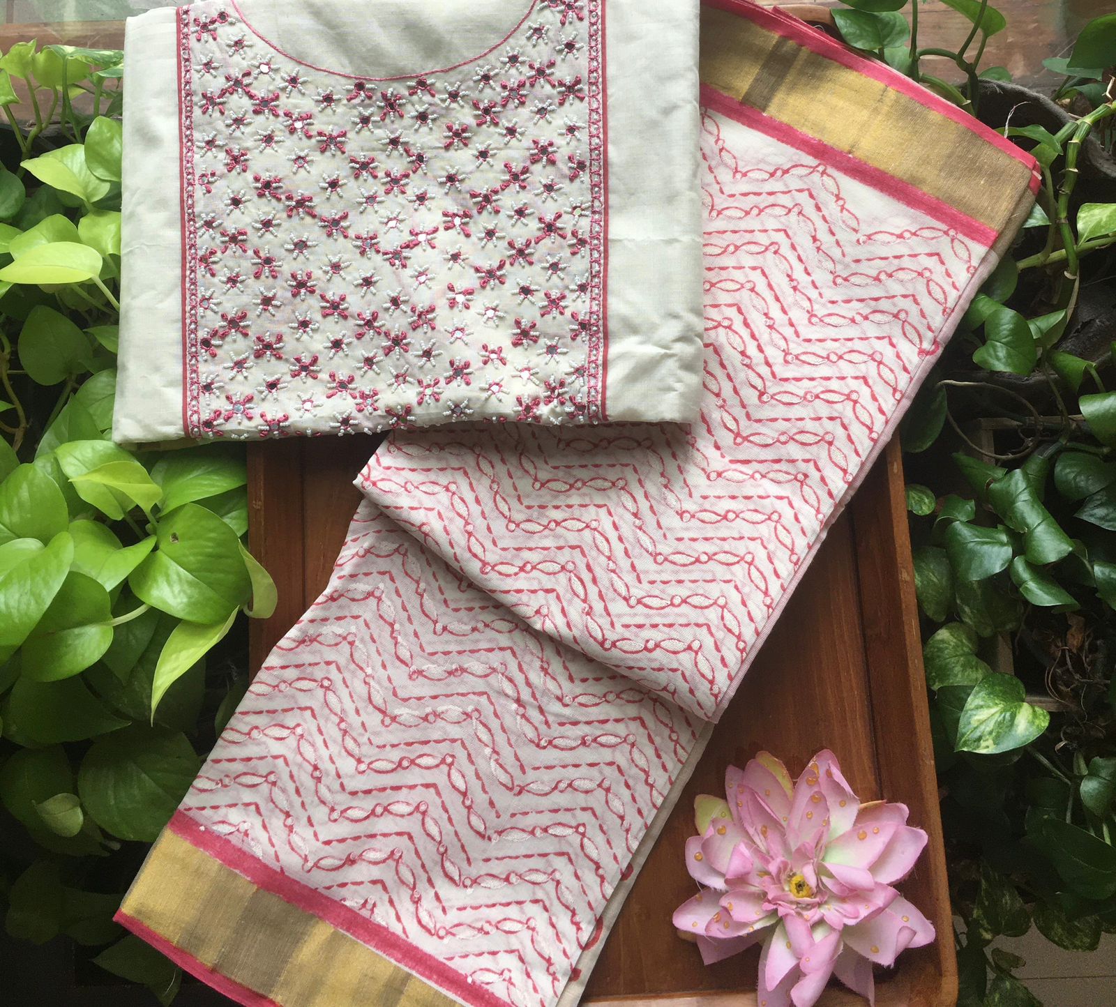 • Presenting out Brand New Collection for Onam at a Special Price of ₹1499/- curated on Chiffon woth Cutwork and beautiful floral embroidery! Ethereal hues of Pink, Pearl Green, Ivory gold, Dusty pink & Jet black on Chiffon top and Duppatta with floral embroidery & Cutwork. The floral embroidery design is created to resemble pearl embroidery. Bottom is cotton silk ₹1,499.00