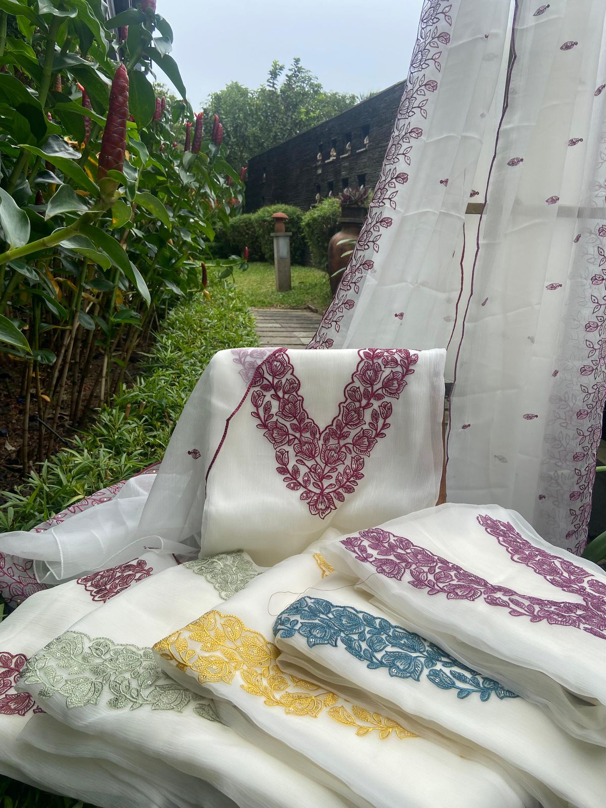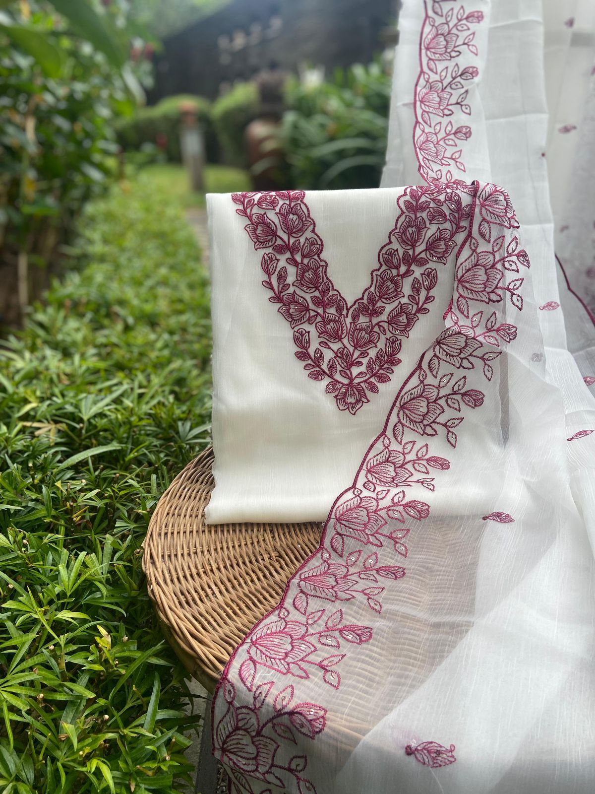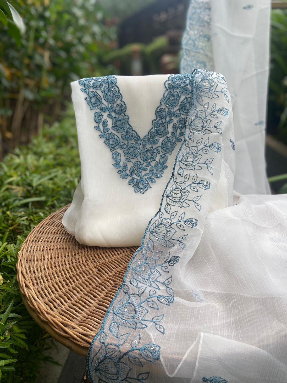 A beautiful & premium collection in pure cotton top with intricate embroidery all along front , cotton bottom & a beautiful chiffon Duppatta with floral block prints ₹2,990.00