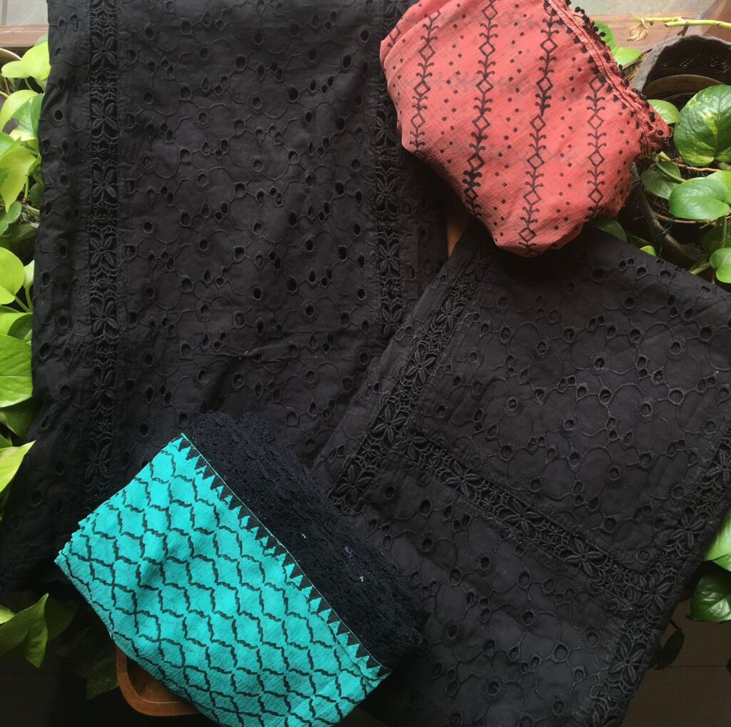 • Presenting a stunning collection of Cutwork Hakoba top with lace detailing , cotton bottom & chiffon Duppatta Limited pieces available!!!Hurry & order these before we run out of them! Perfect choice for gifting your dear ones this festive season ₹2,790.00