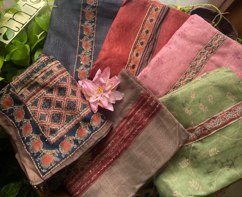 A beautiful pure linen suit either complete embroidered & Ajrak borders & block printed Ajrak linen Duppatta . Linen & Ajrak a beautiful & unique combo. Cotton bottom ₹3,990.00