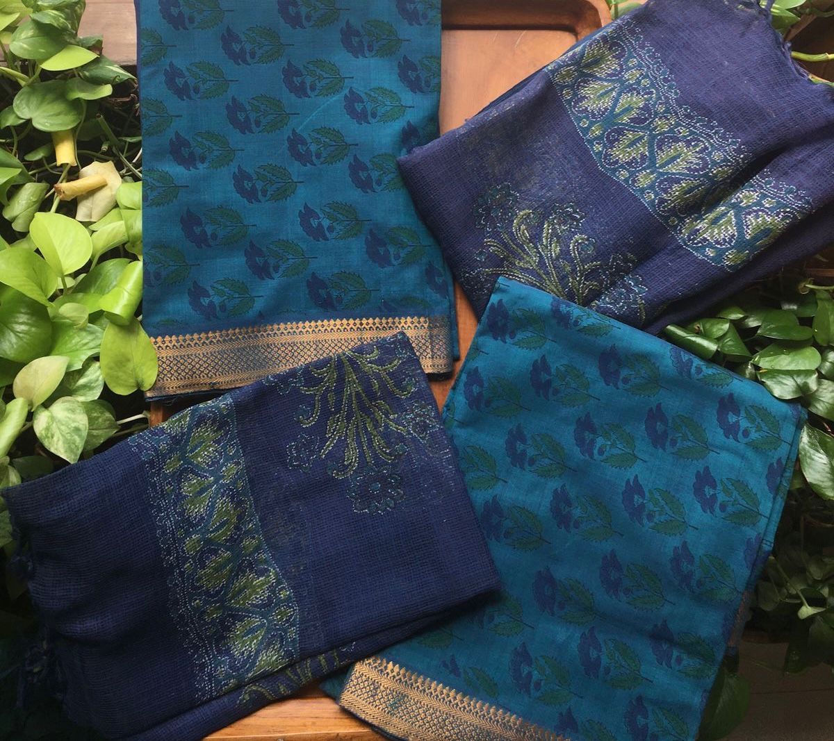 A beautiful collection of Cotton suits on pure mangalgiri cotton top with beautiful block prints and border , cotton bottom and Kota Doria Duppatta
