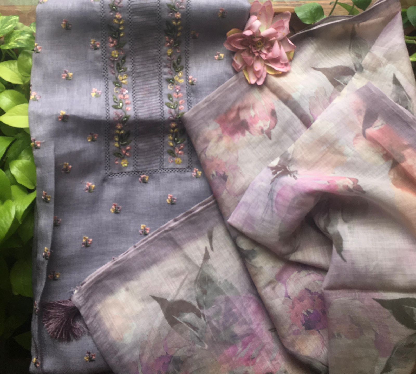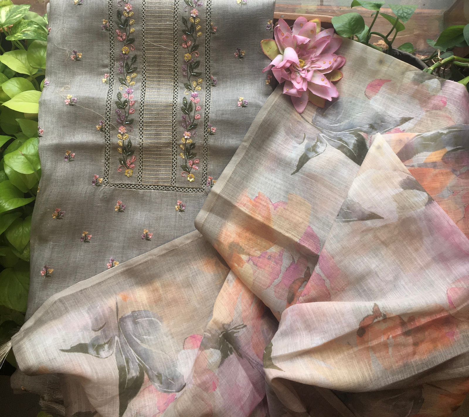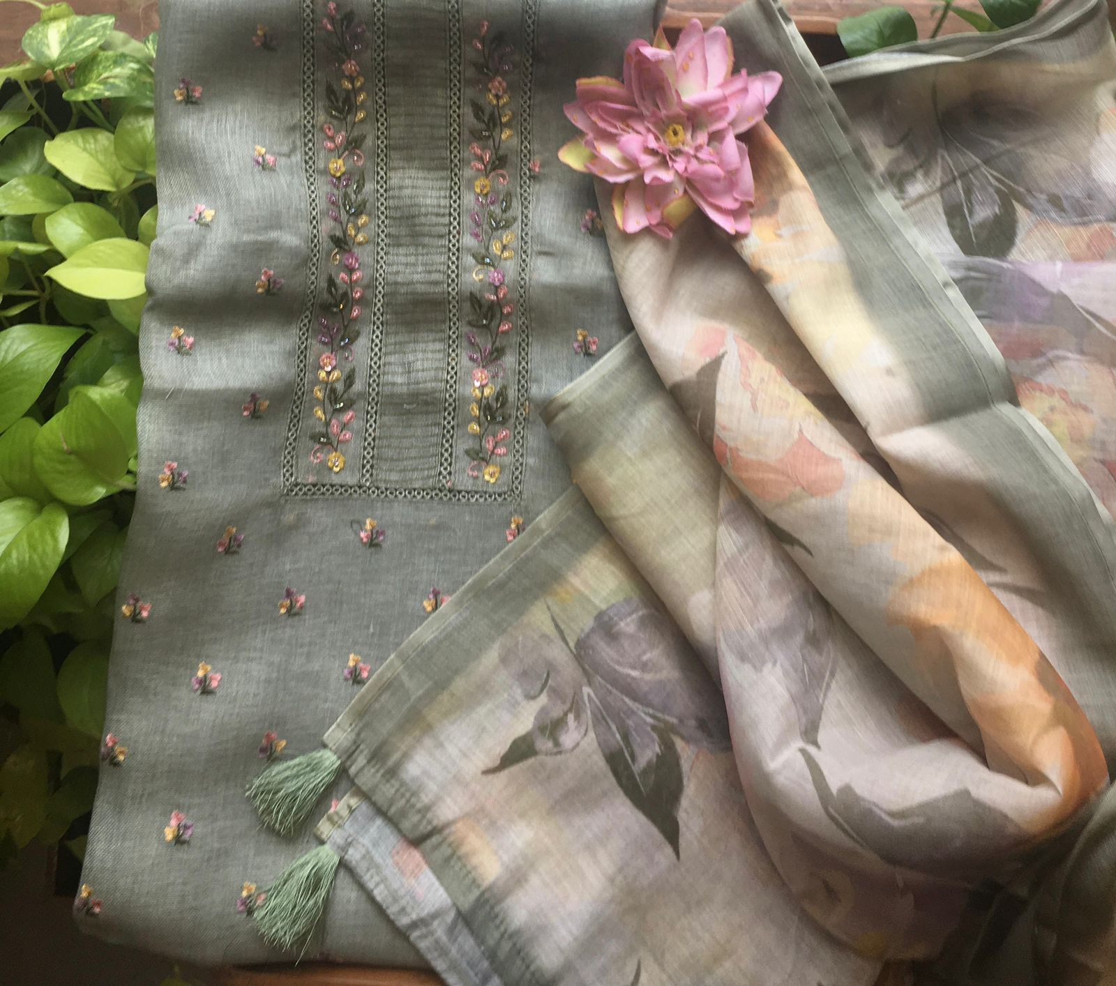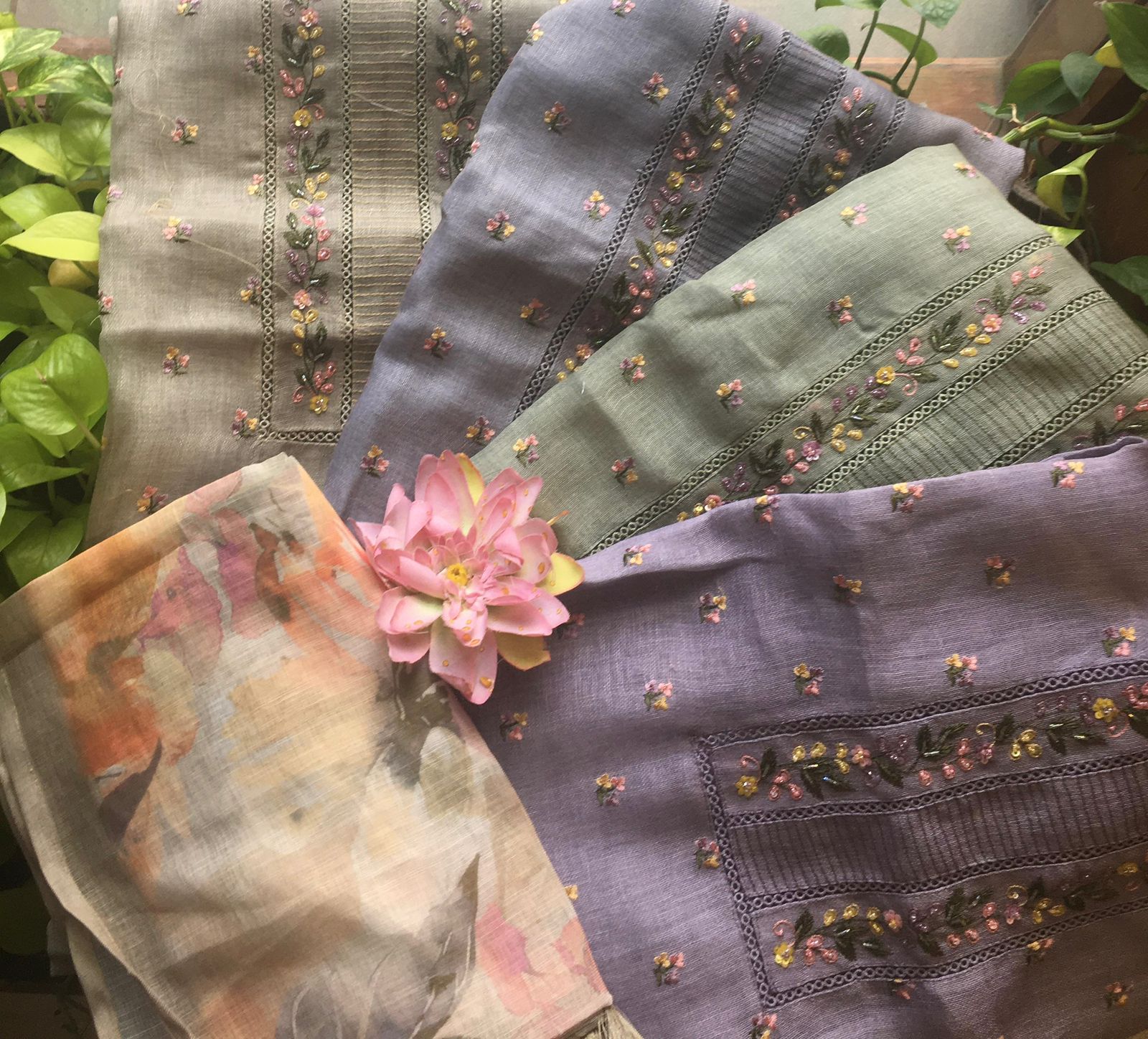 Beautiful Linen Suits in lovely handpicked color hues with exquisite hand embroidery featuring bullion knots, satin stitches, French knots n more