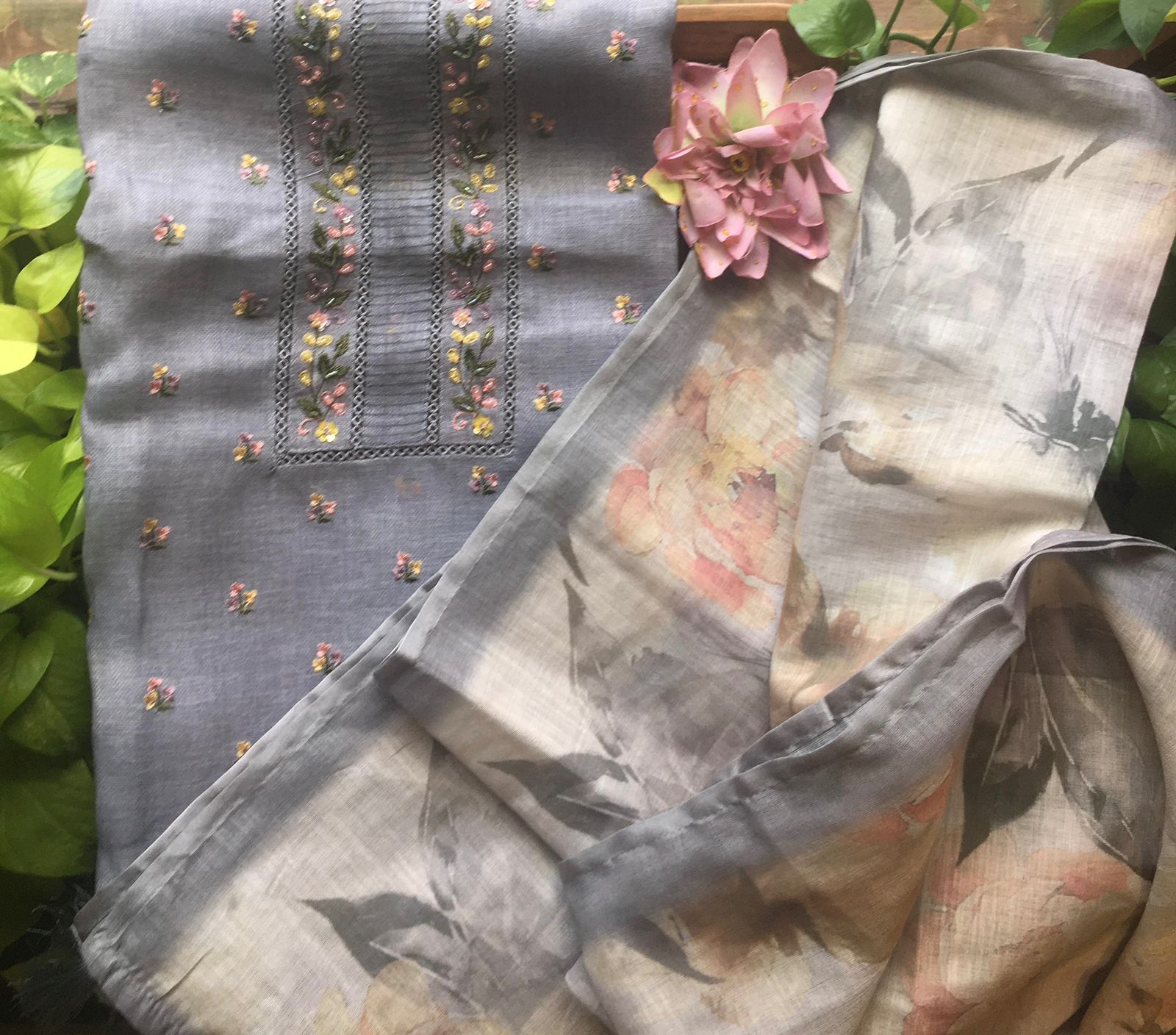 A beautiful collection of Linen top with beautiful embroidery all along top, santoon bottom &  linen Duppatta with floral prints