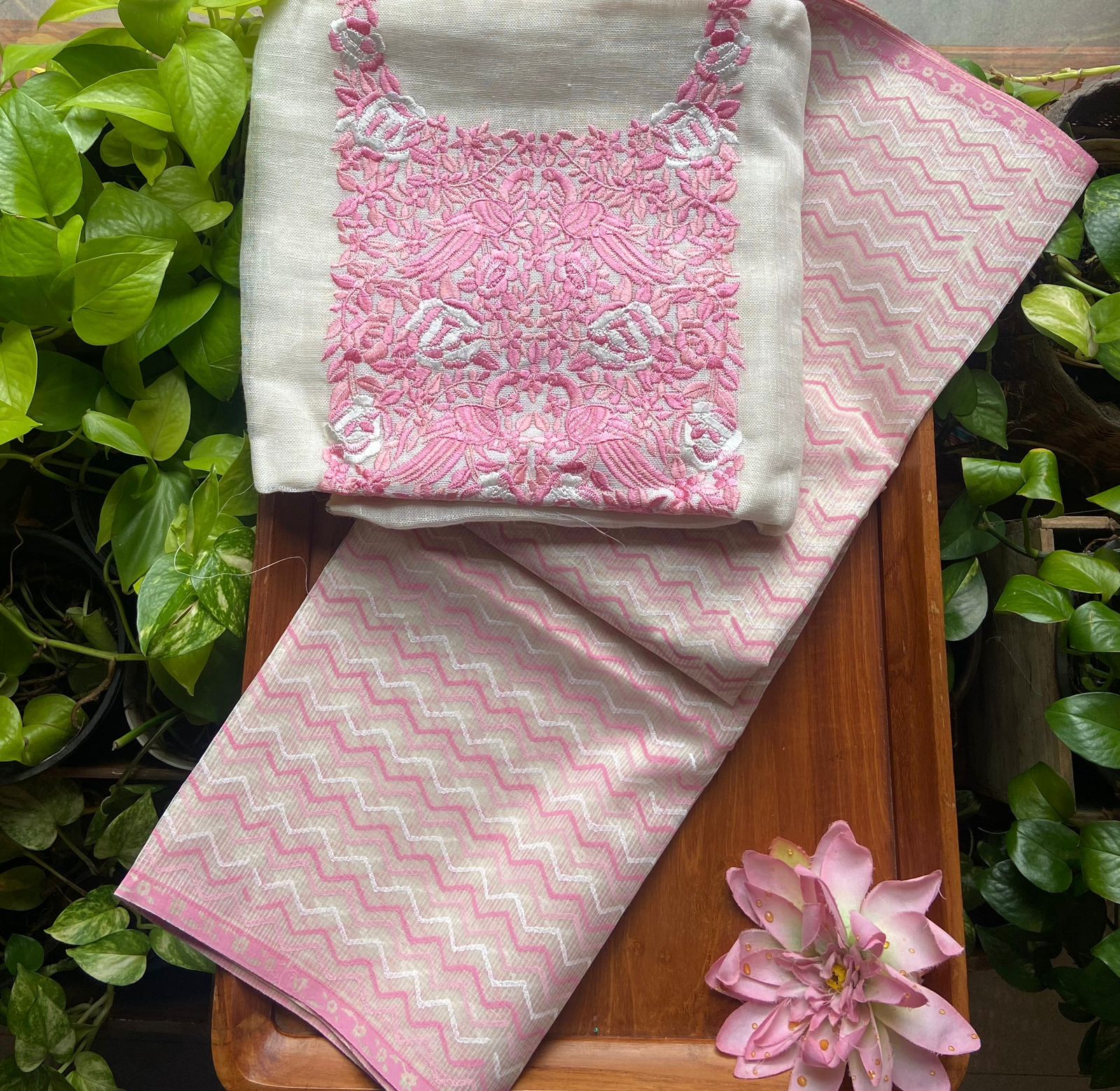 A beautiful collection of Linen top with intricate floral embroidery on yoke, cotton silk botton & printed silk Duppatta