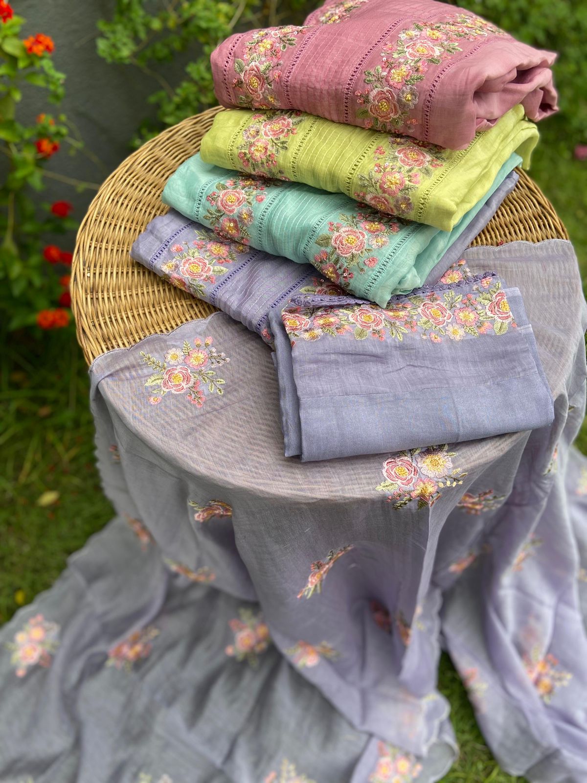 Beautiful Linen Suits in lovely handpicked color hues with exquisite hand embroidery featuring bullion knots, satin stitches, French knots n more