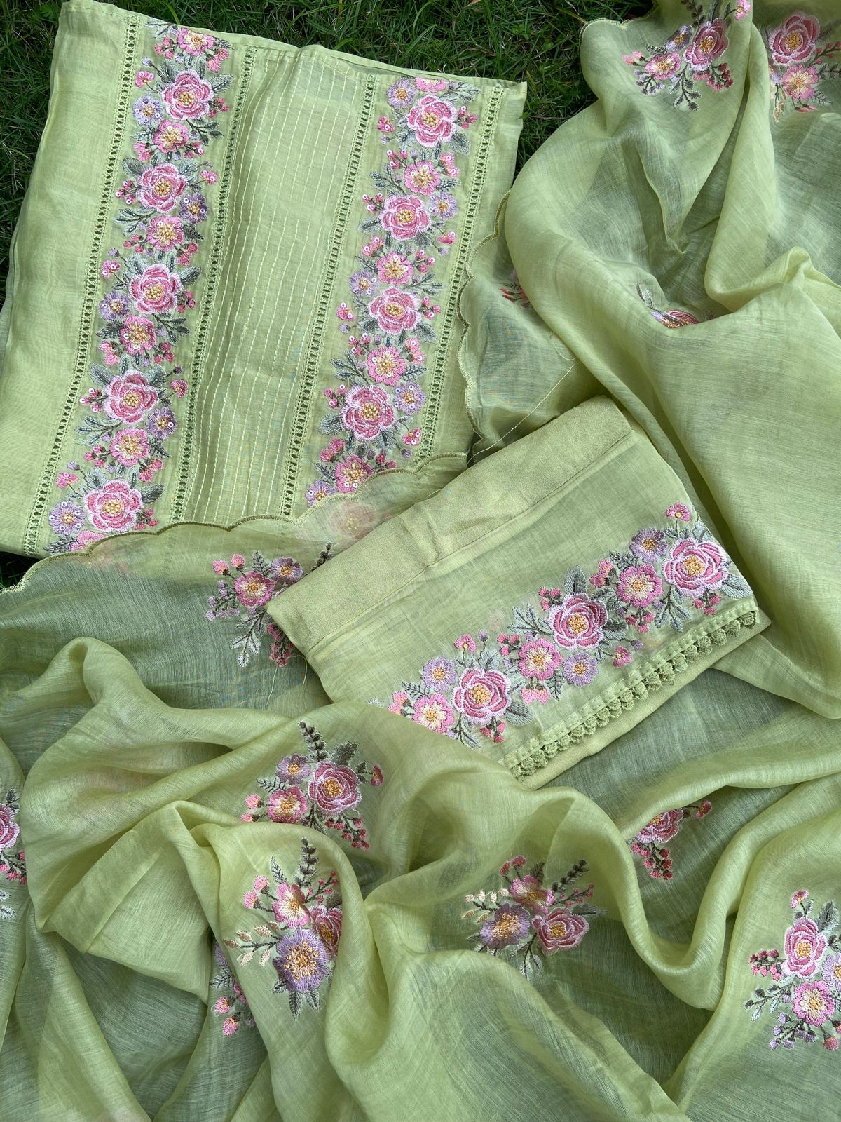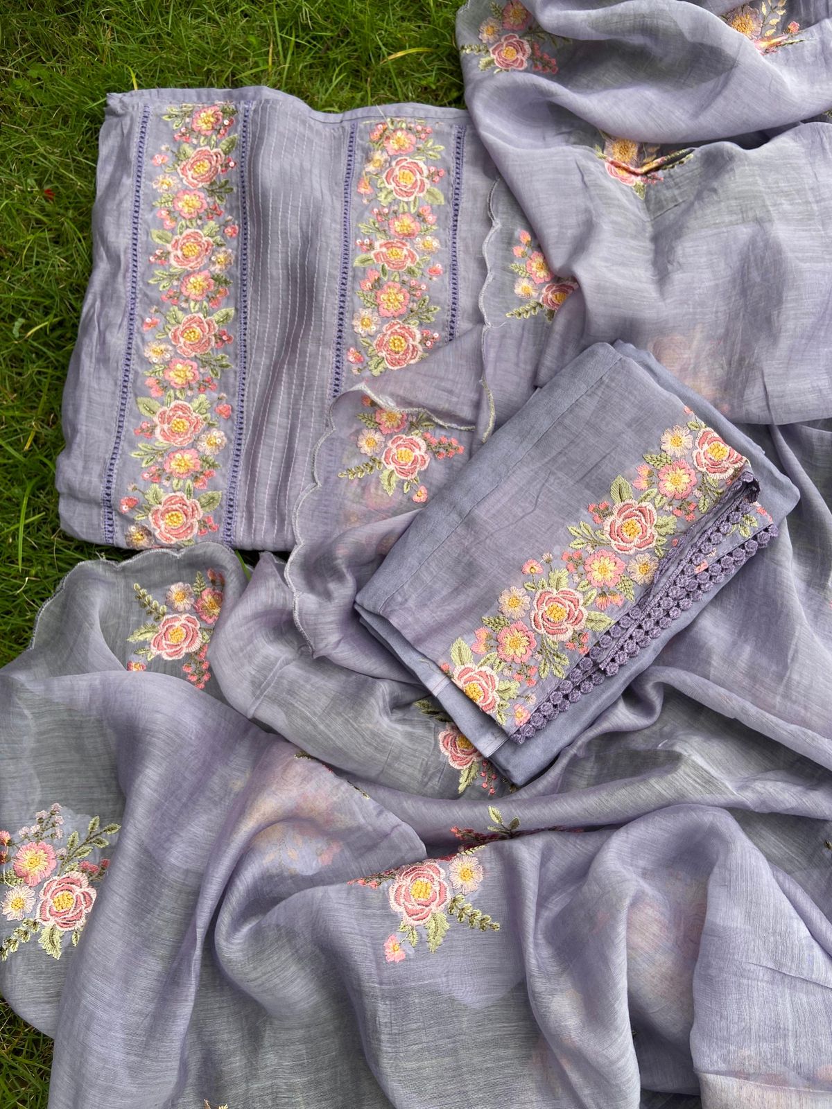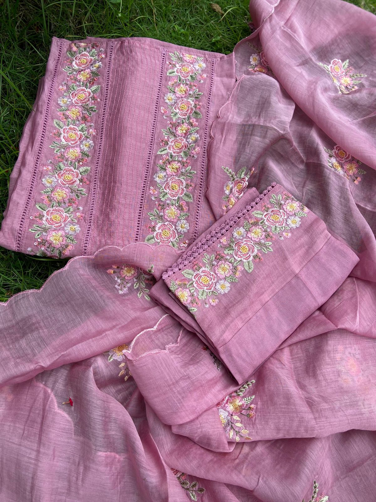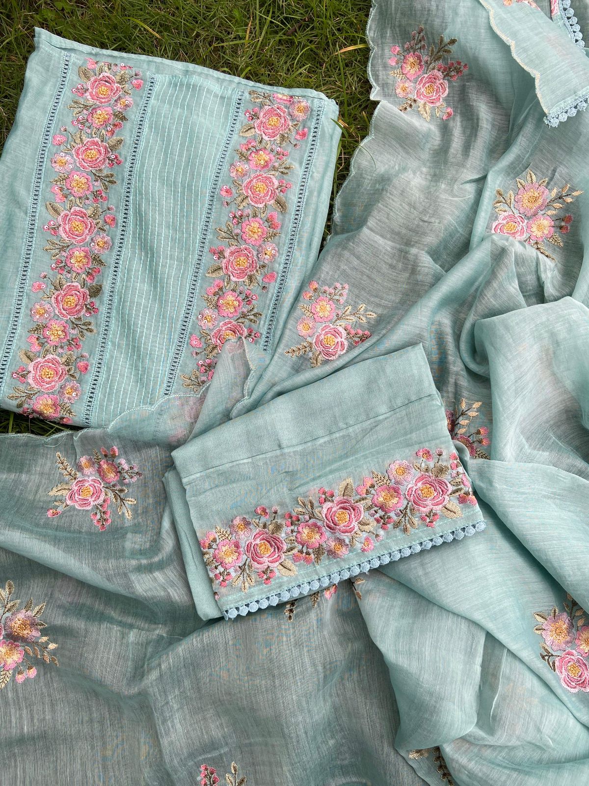 A beautiful collection of premium pure Mal Chandheri silk top with intricate hand embroidery at yoke & sleeves ,santoon bottom also with embroidery & Duppatta with exquisite embroidery throughout