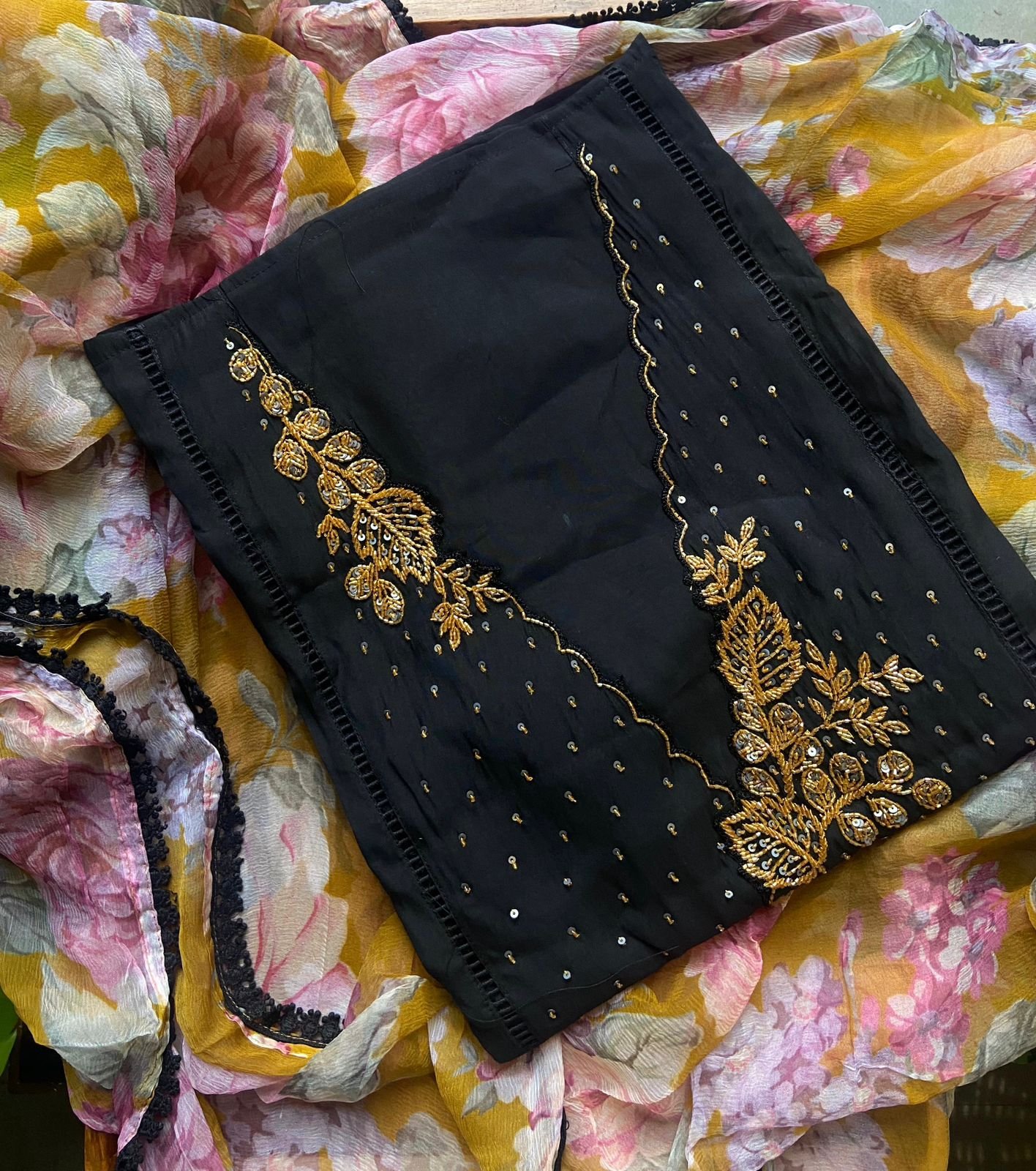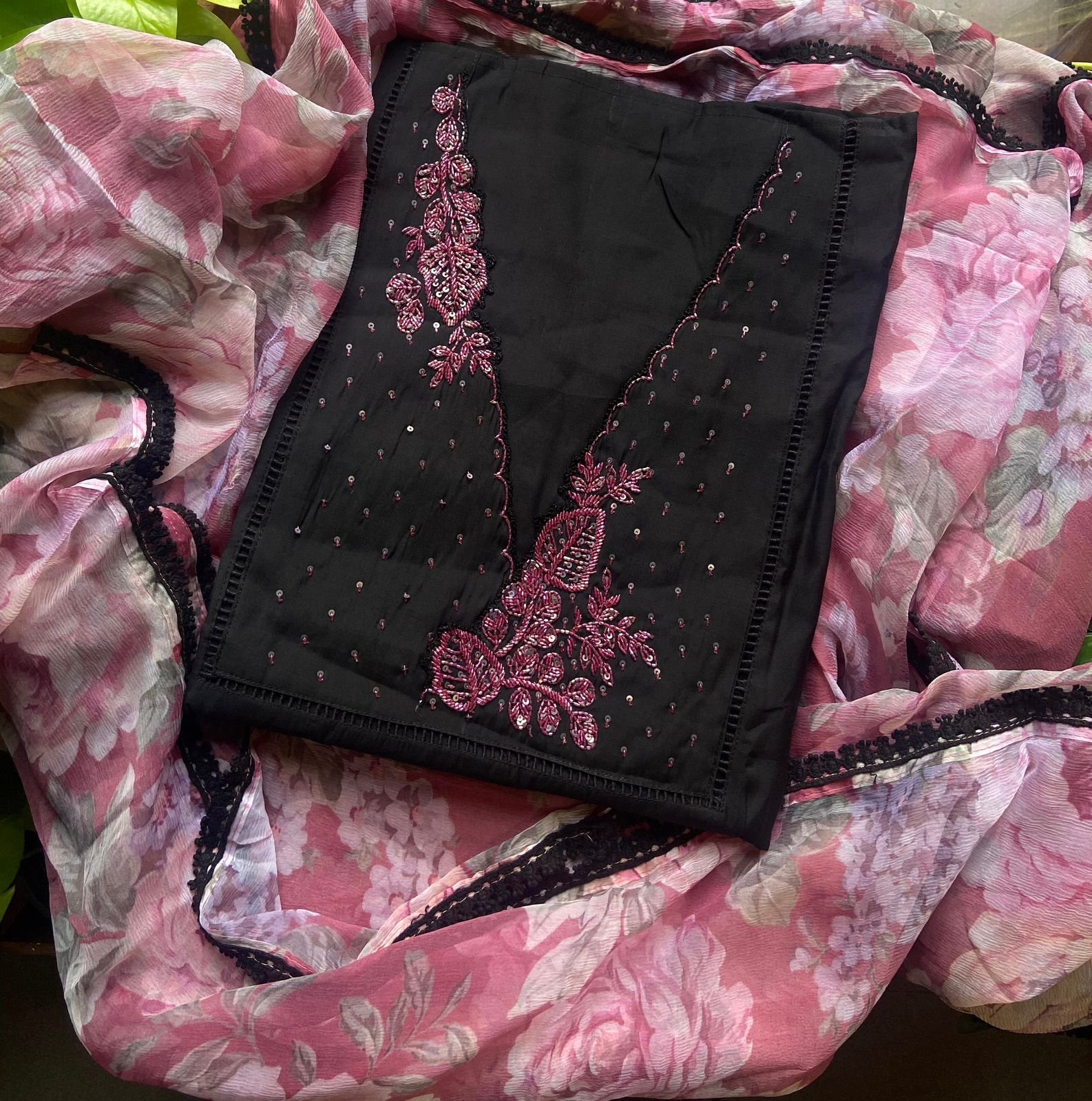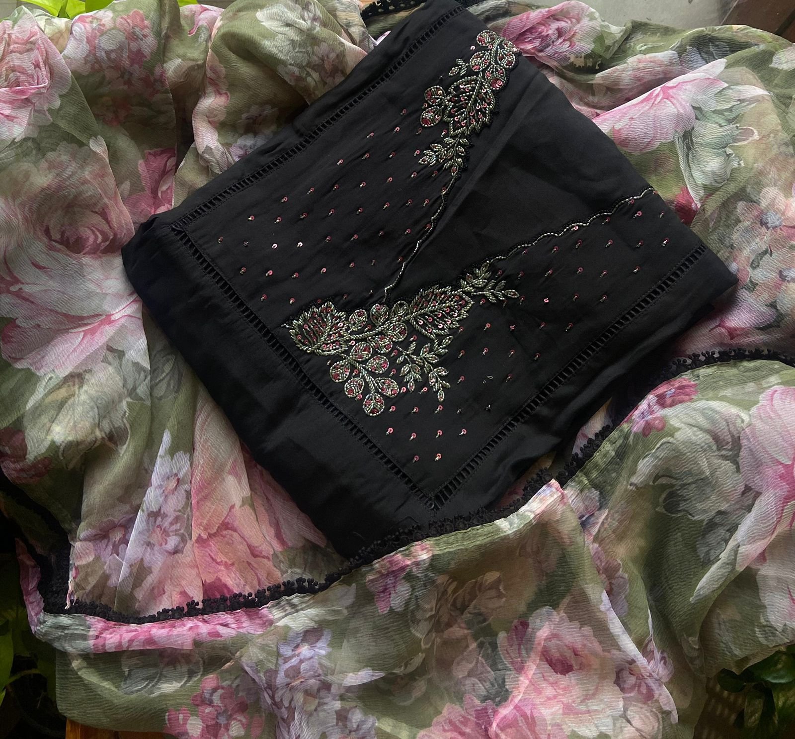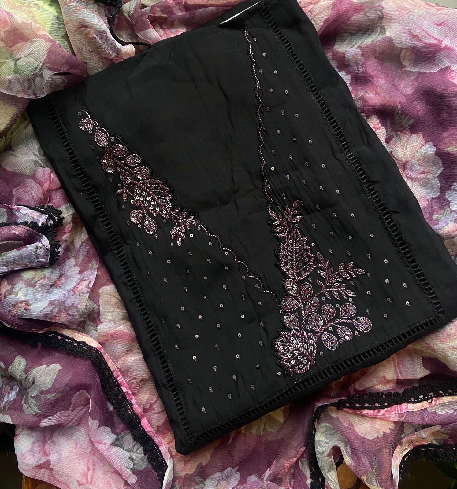 Presenting out Brand New Collection for Onam at a Special Price of ₹1499/- curated on Chiffon woth Cutwork and beautiful floral embroidery! Ethereal hues of Pink, Pearl Green, Ivory gold, Dusty pink & Jet black on Chiffon top and Duppatta with floral embroidery & Cutwork. The floral embroidery design is created to resemble pearl embroidery. Bottom is cotton silk